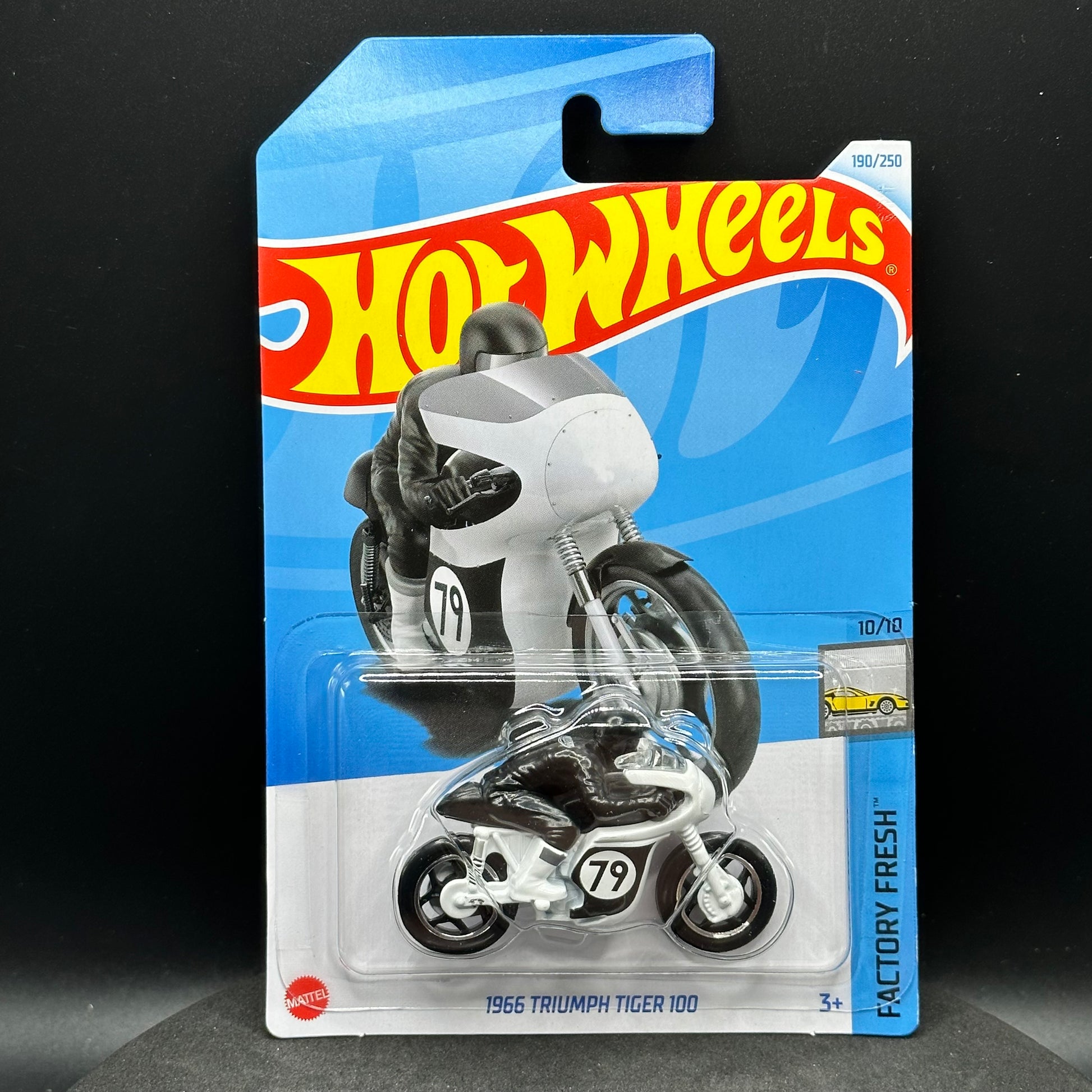 Hot Wheels 1966 Triumph Tiger 100 in white. There are multiple available and you might not get the exact one in the picture. They are all in good condition but may have slightly soft corners or lightly dented edges. All Hot Wheels will be individually wrapped in bubble wrap and shipped in a box for added protection.