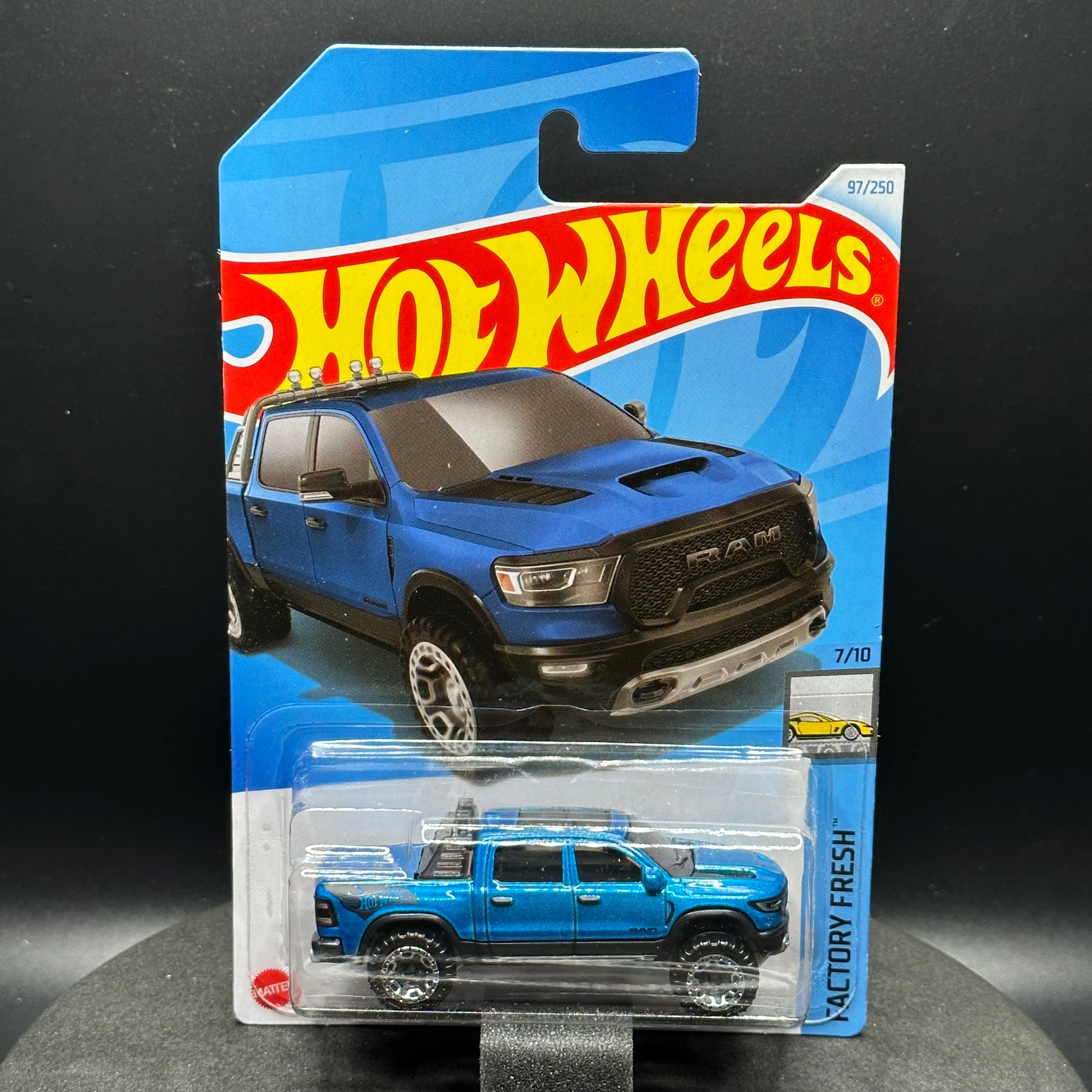 Hot Wheels ‘23 Ram 1500 in blue. There are multiple available and you might not get the exact one in the picture. They are all in good condition but may have slightly soft corners or lightly dented edges. All Hot Wheels will be individually wrapped in bubble wrap and shipped in a box for added protection.