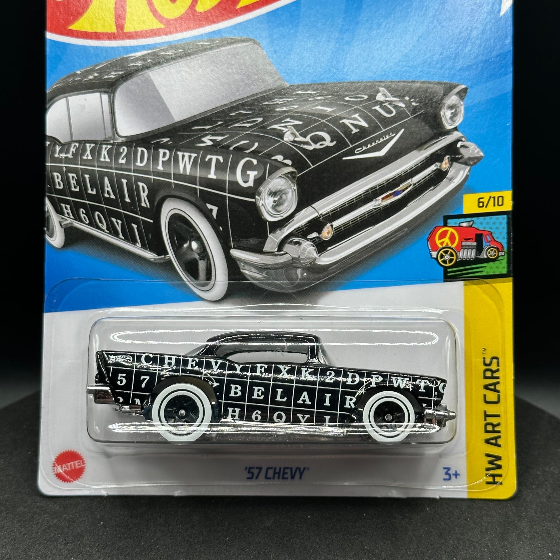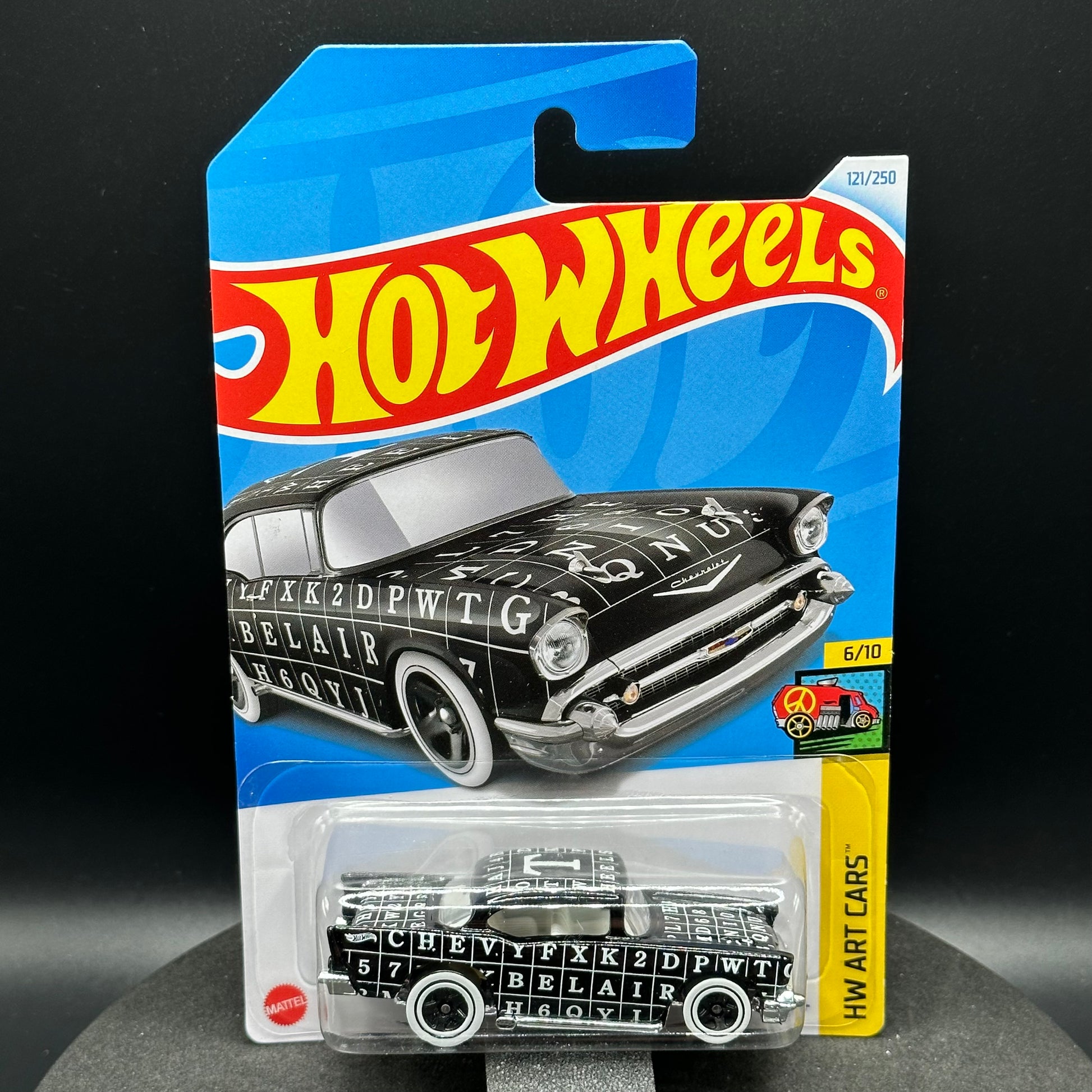 Hot Wheels ‘57 Chevy in black with white letters. Spells ‘57 Chevy Bel Air on the side and Hot Wheels on the roof. There are multiple available and you might not get the exact one in the picture. They are all in good condition but may have slightly soft corners. All Hot Wheels will be wrapped in bubble wrap and shipped in a box for added protection.