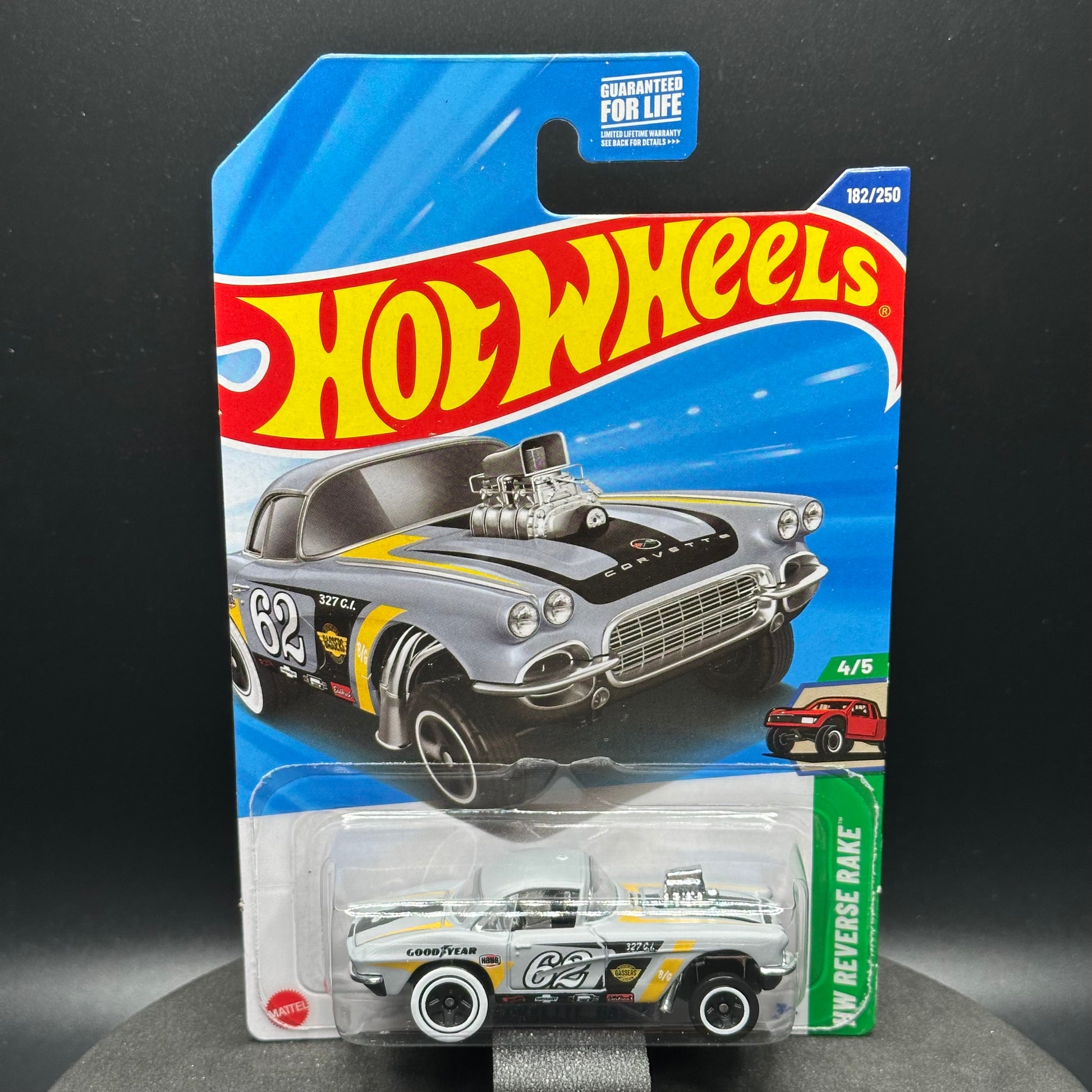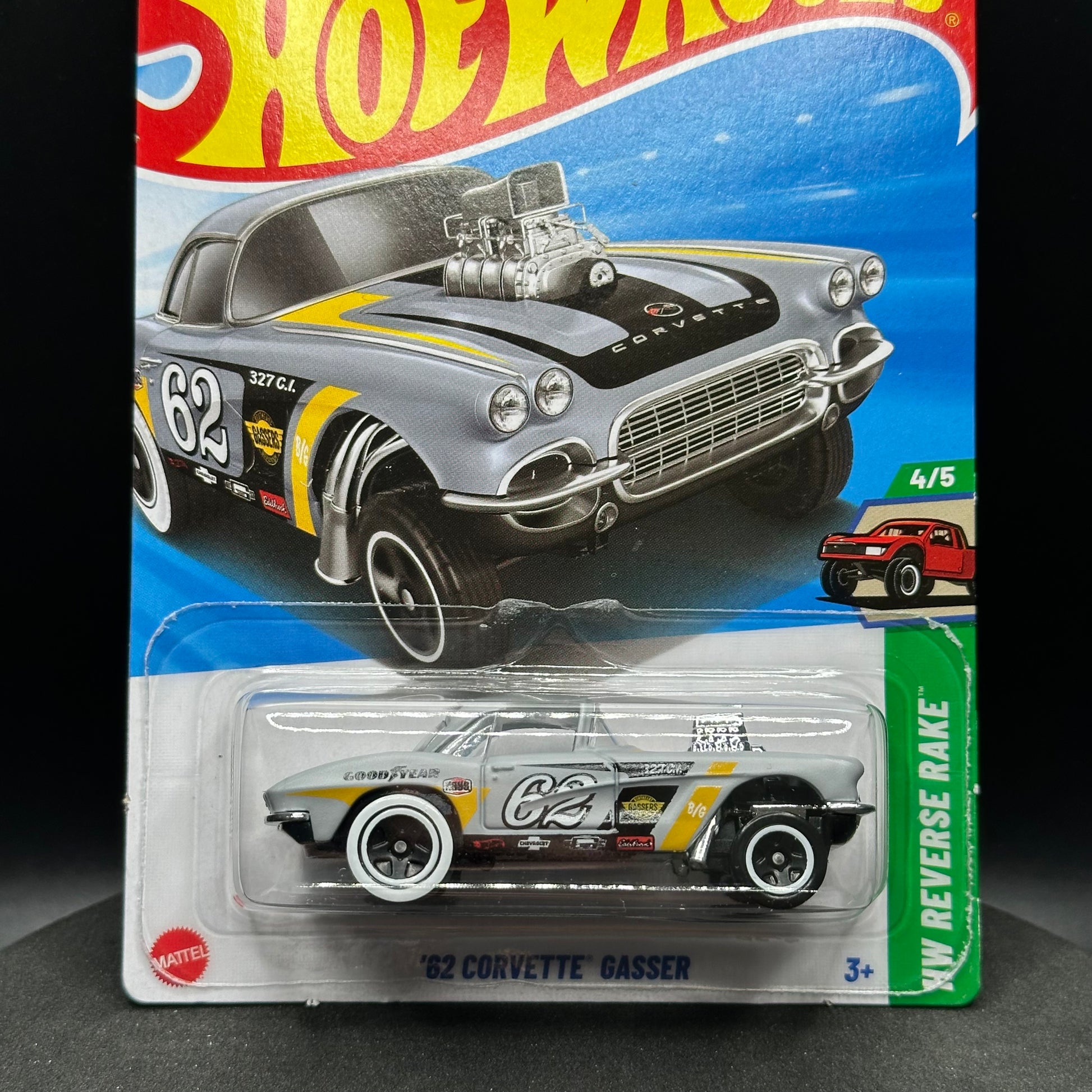 Hot Wheels ‘62 Corvette Gasser in gray. There are multiple available and you might not get the exact one in the picture. They are all in good condition but may have slightly soft corners or lightly dented edges. All Hot Wheels will be individually wrapped in bubble wrap and shipped in a box for added protection.