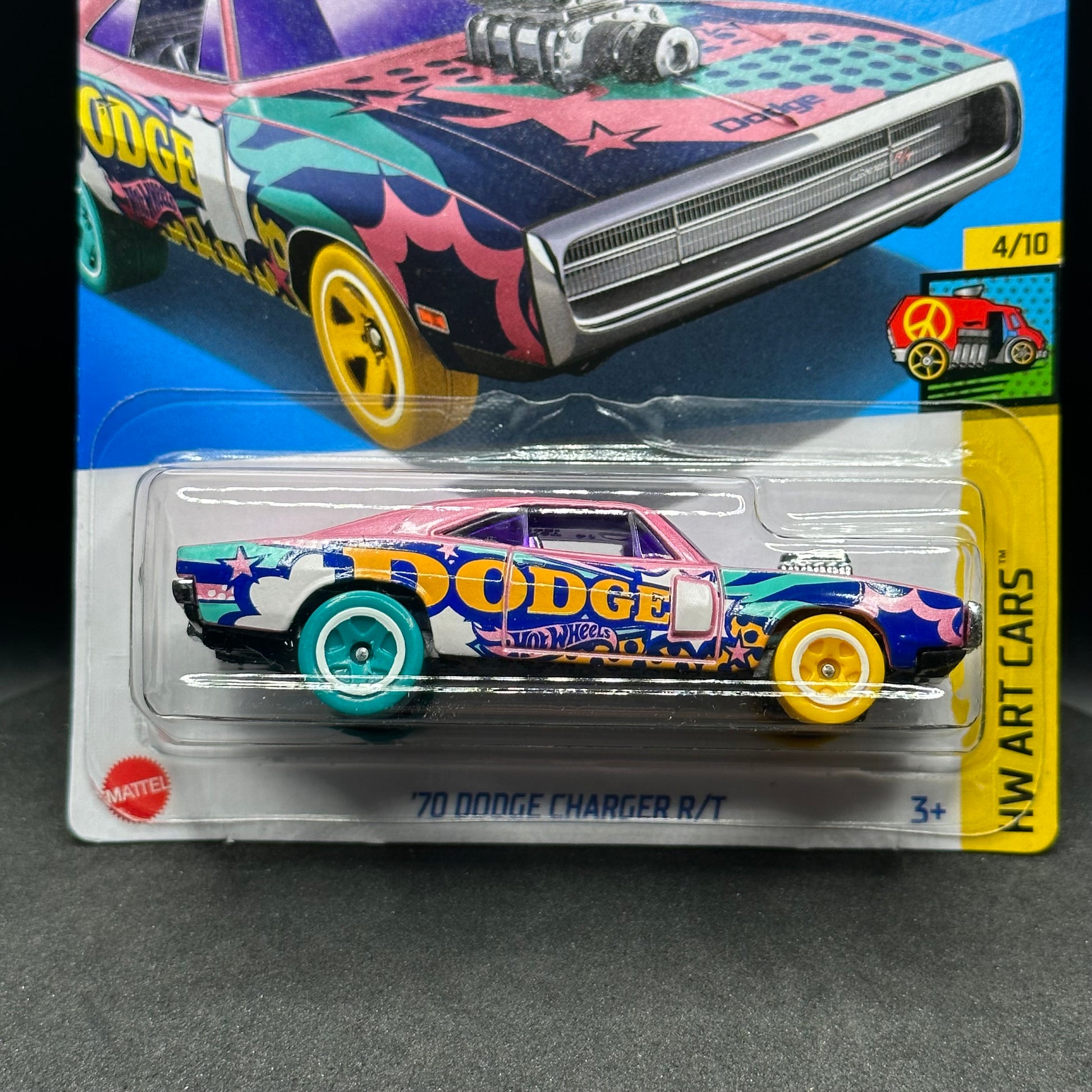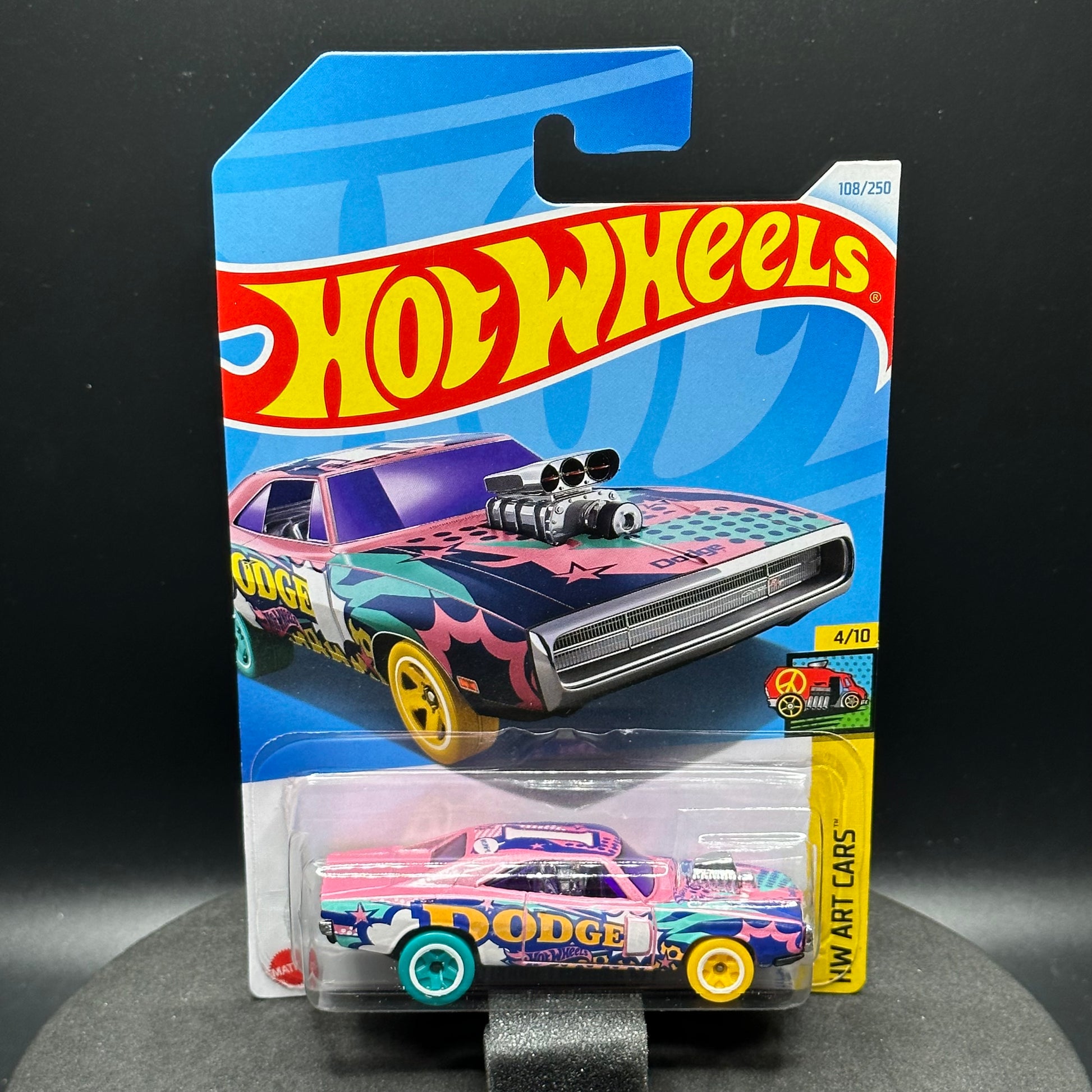 Hot Wheels ‘70 Dodge Charger R/T in pink. There are multiple available and you might not get the exact one in the picture. They are all in good condition but may have slightly soft corners or lightly dented edges. All Hot Wheels will be individually wrapped in bubble wrap and shipped in a box for added protection.