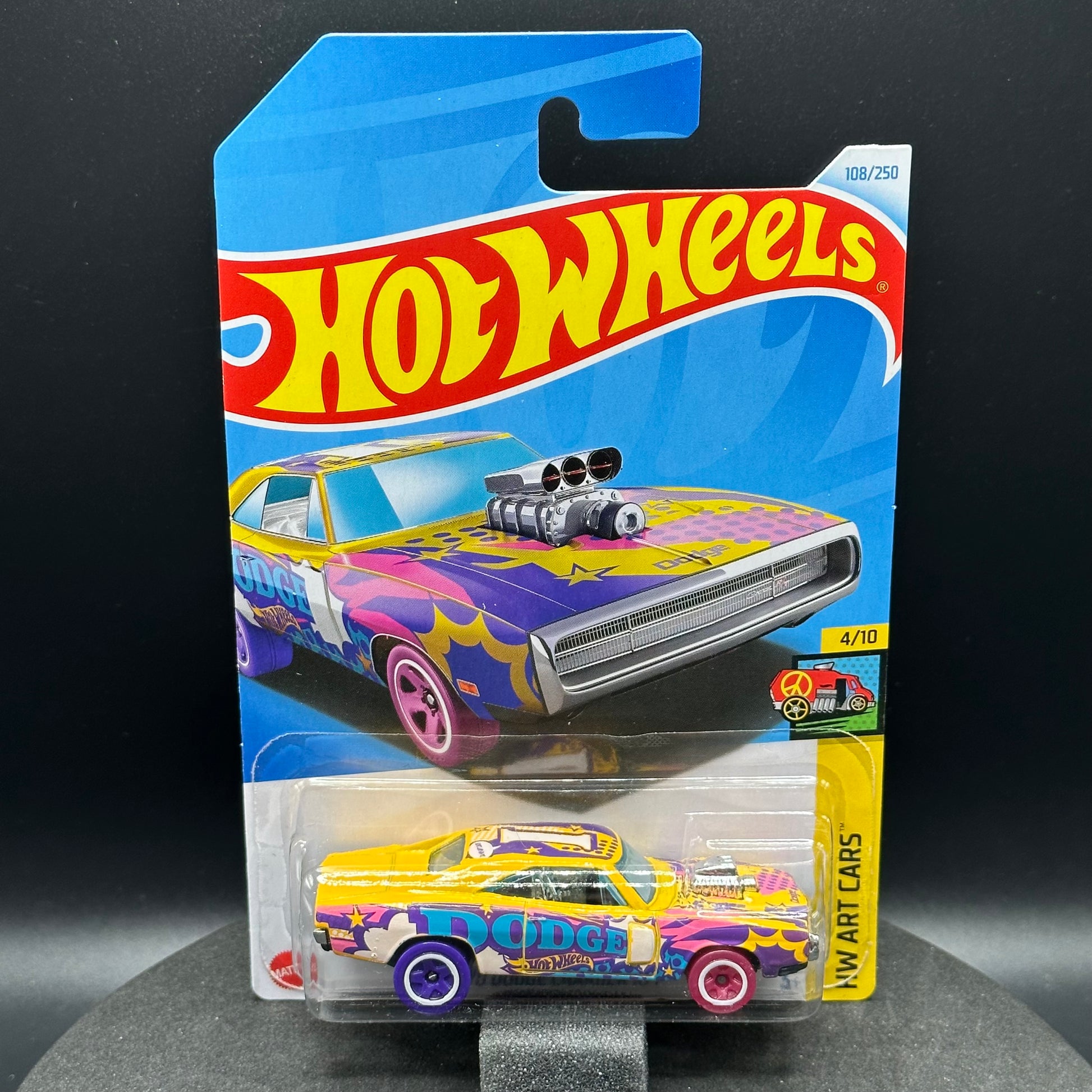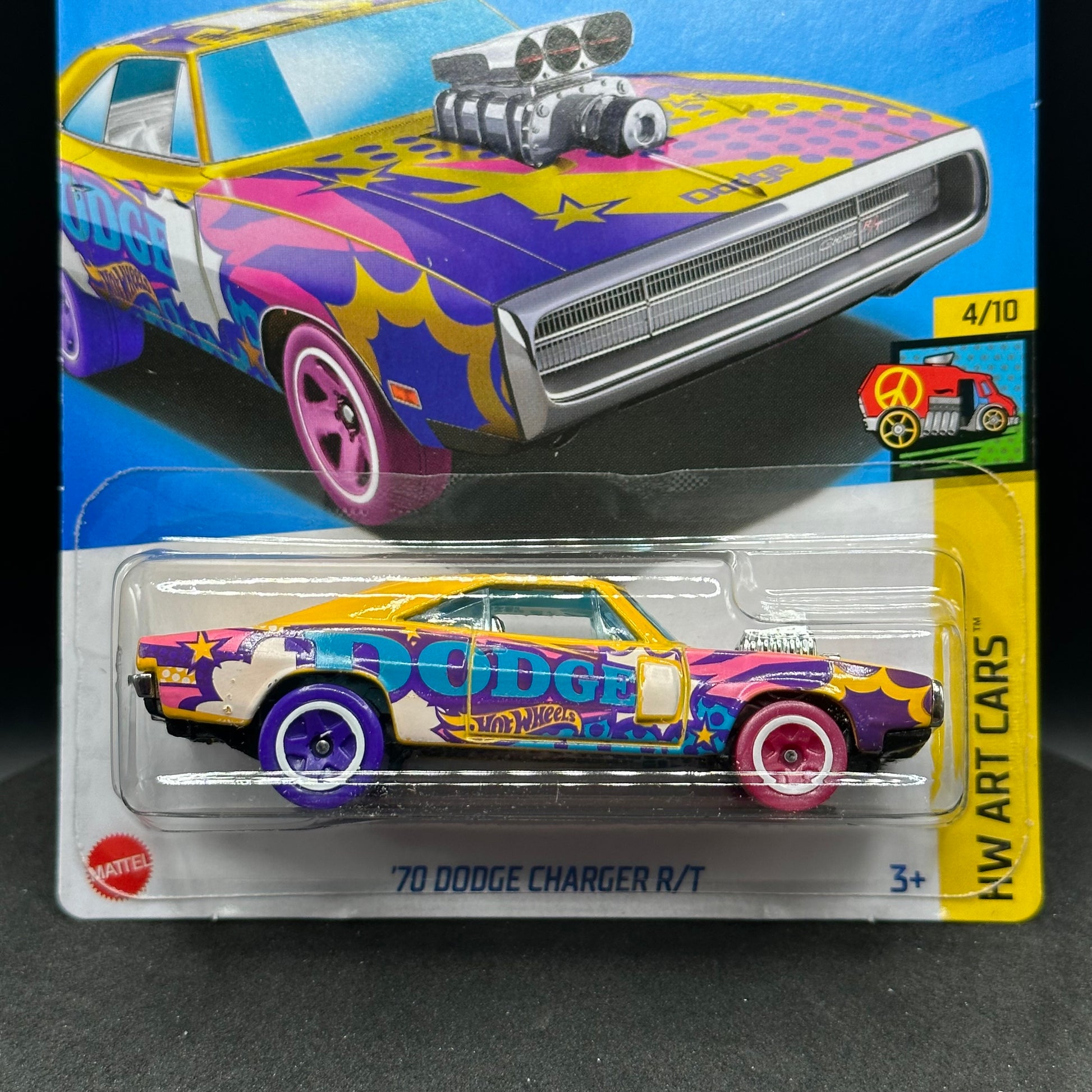 Hot Wheels ‘70 Dodge Charger R/T in yellow and purple. There are multiple available and you might not get the exact one in the picture. They are all in good condition but may have slightly soft corners. All Hot Wheels will be wrapped in bubble wrap and shipped in a box for added protection.