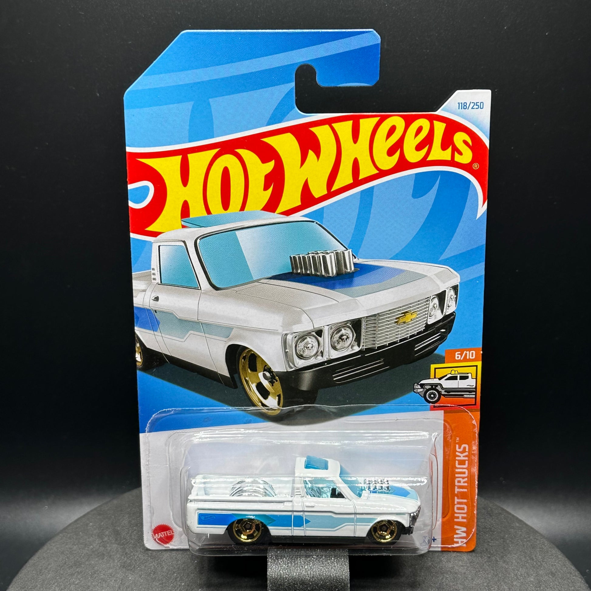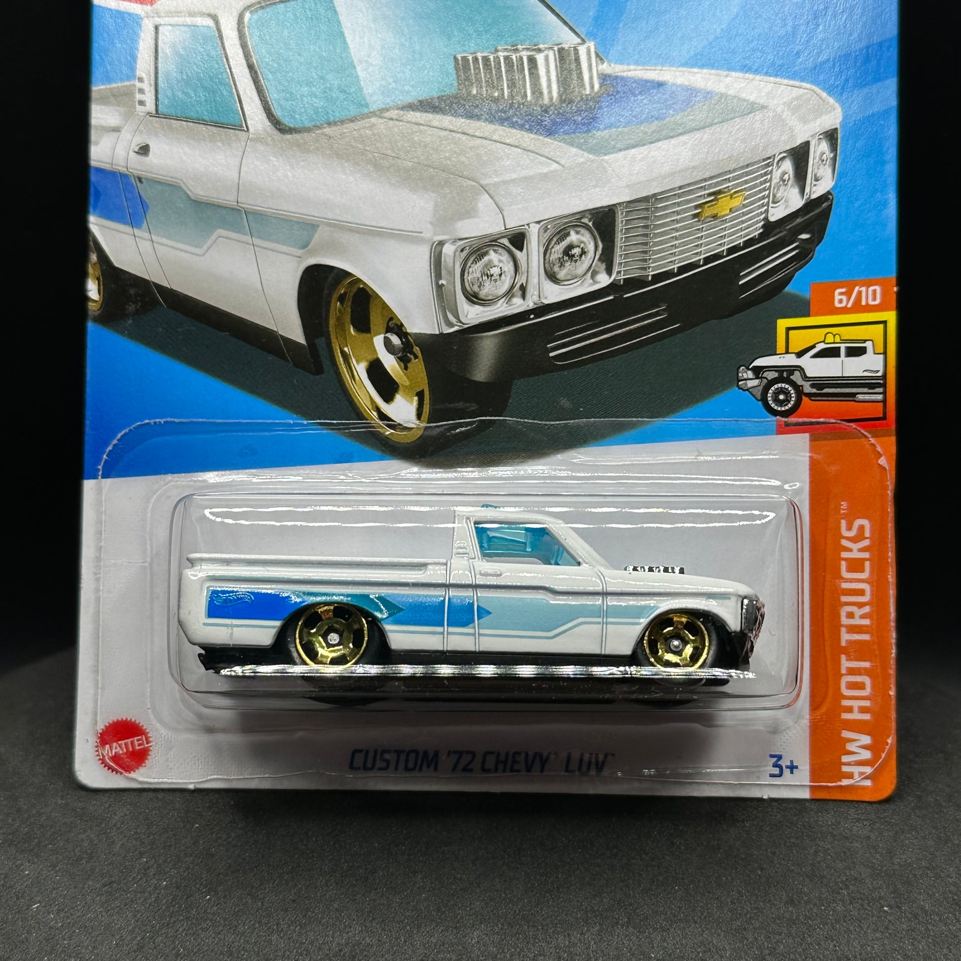 Hot Wheels Custom ‘72 Chevy Luv in white. There are multiple available and you might not get the exact one in the picture. They are all in good condition but may have slightly soft corners or lightly dented edges. All Hot Wheels will be individually wrapped in bubble wrap and shipped in a box for added protection.