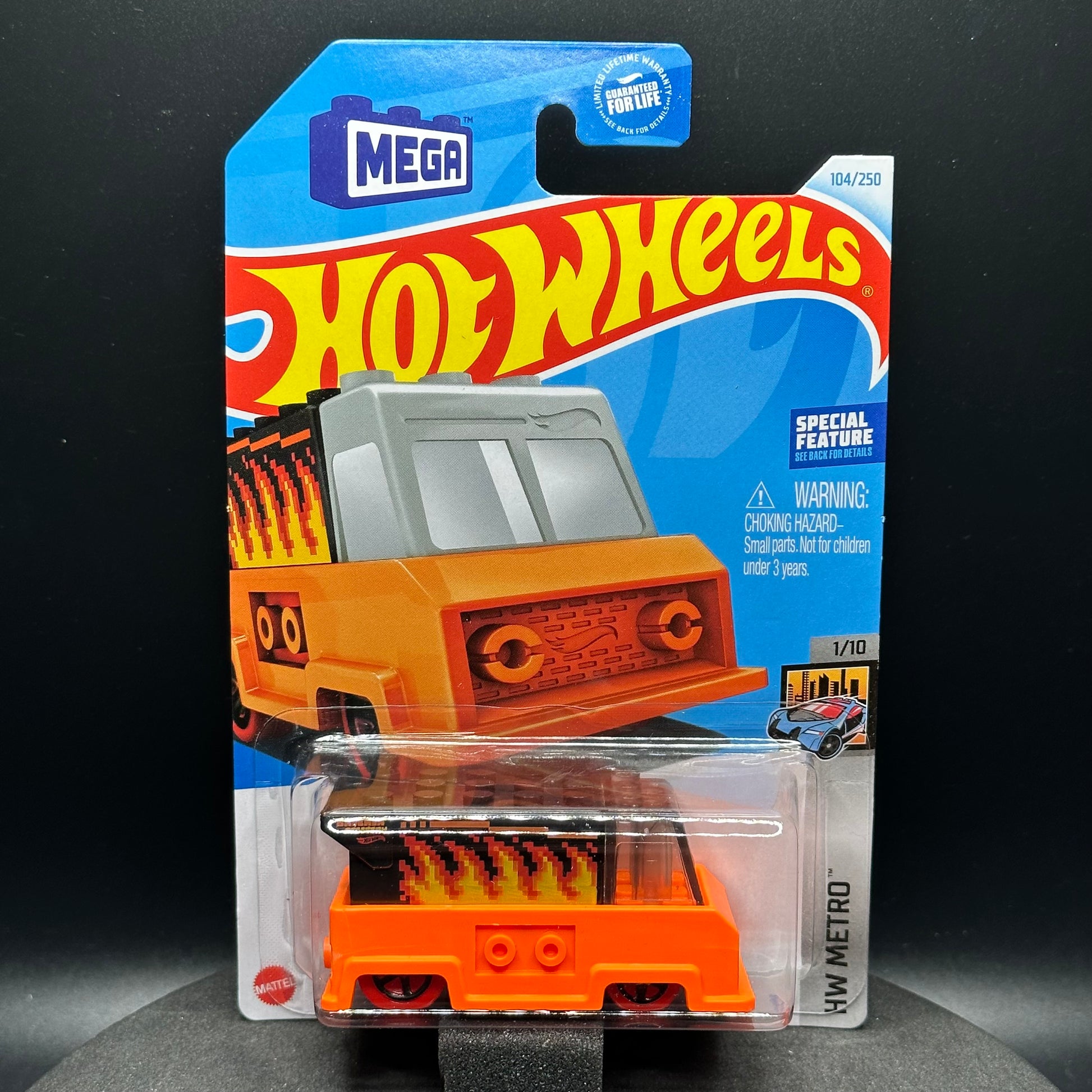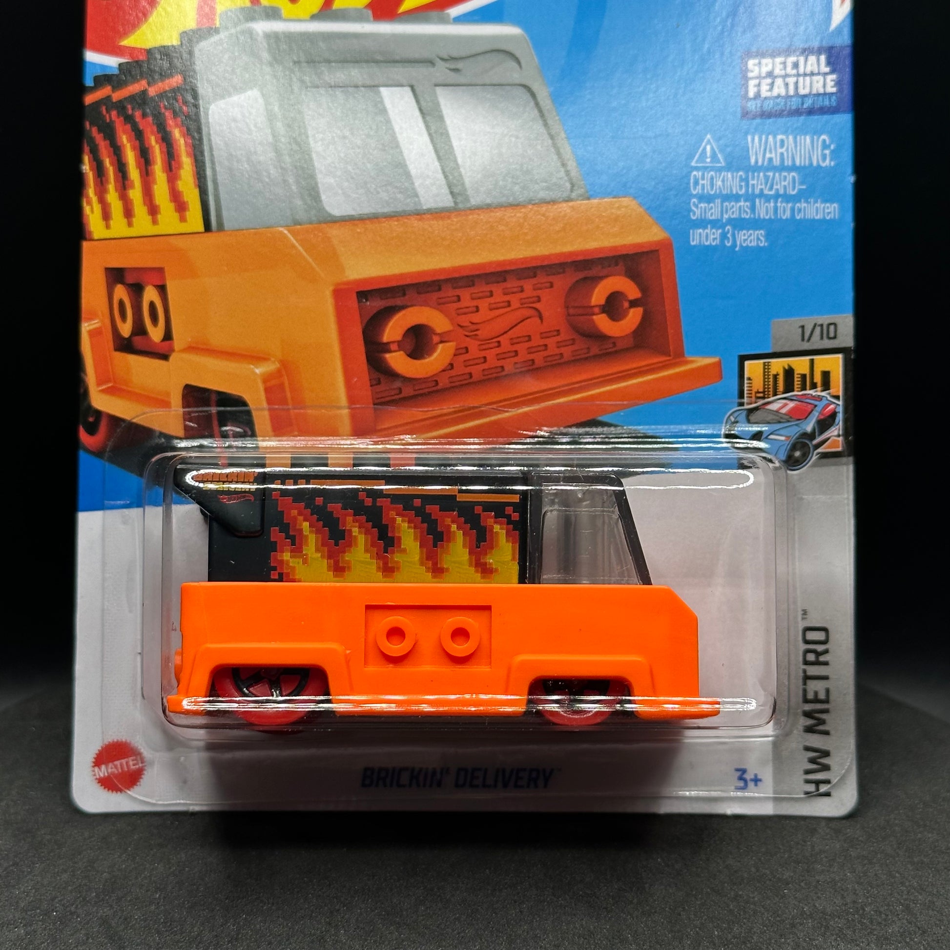 Hot Wheels Brickin Delivery in orange with flames. There are multiple available and you might not get the exact one in the picture. They are all in good condition but may have slightly soft corners or lightly dented edges. All Hot Wheels will be individually wrapped in bubble wrap and shipped in a box for added protection.