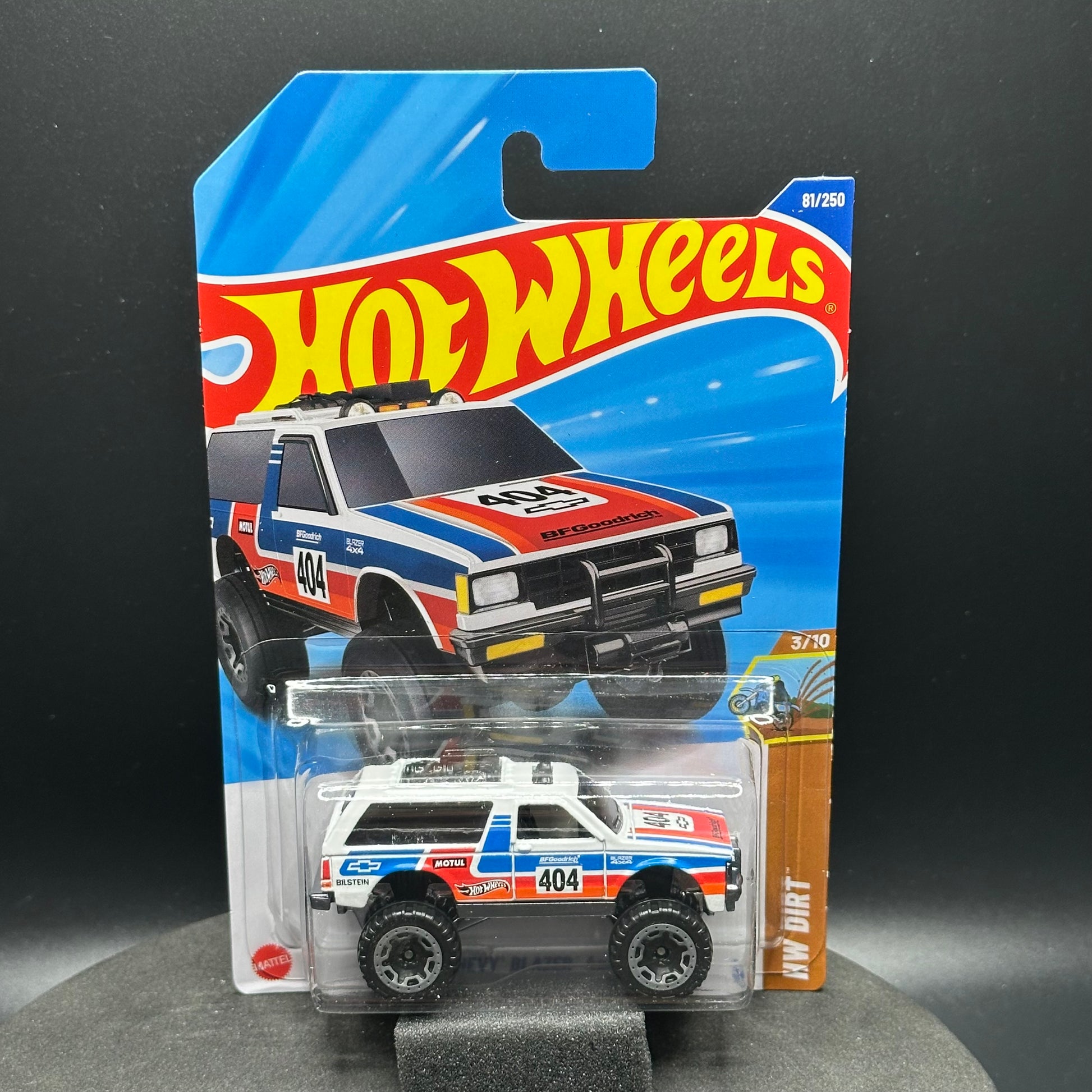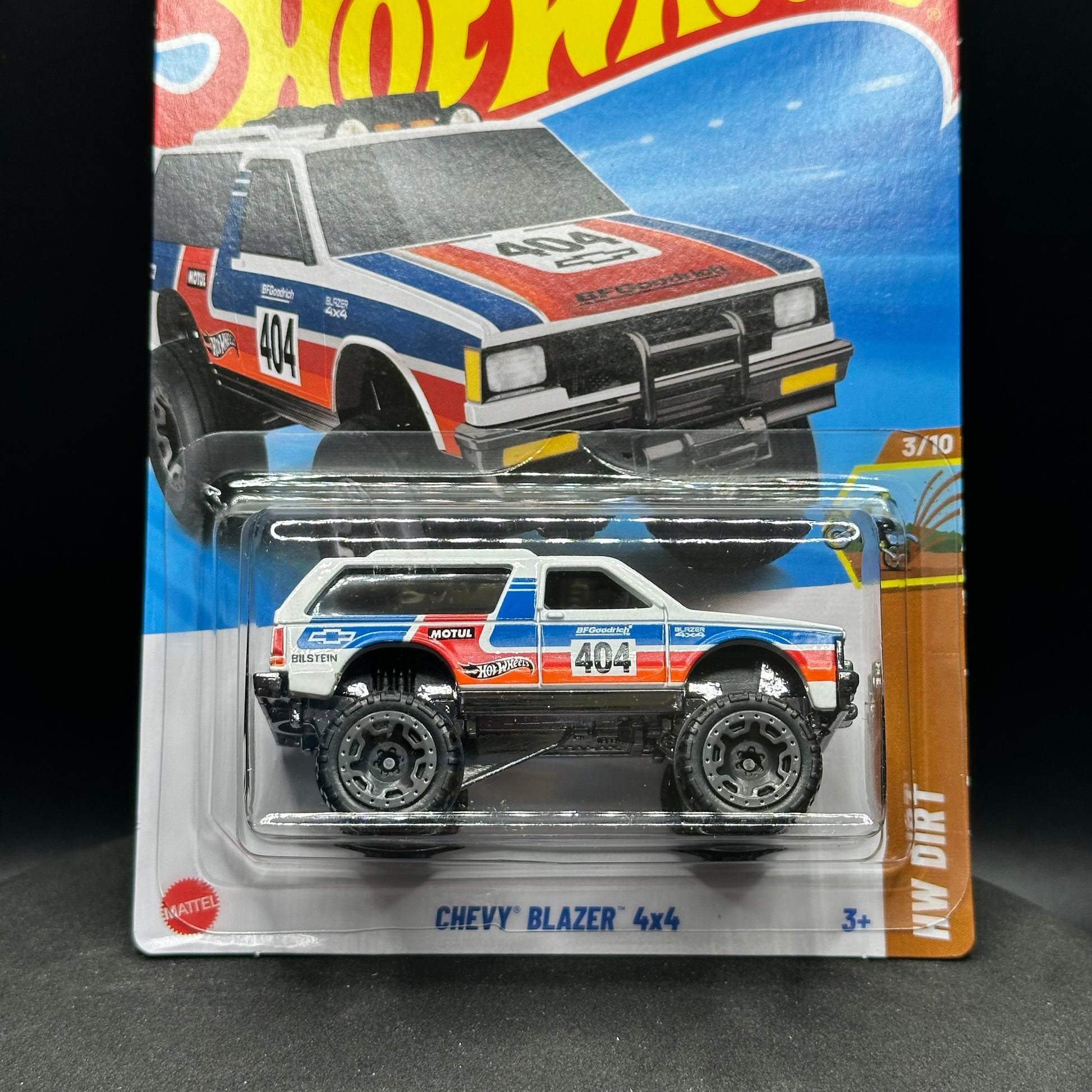 Hot Wheels Chevy Blazer 4x4 in white with red and blue accents. There are multiple available and you might not get the exact one in the picture. They are all in good condition but may have slightly soft corners or lightly dented edges. All Hot Wheels will be individually wrapped in bubble wrap and shipped in a box for added protection.
