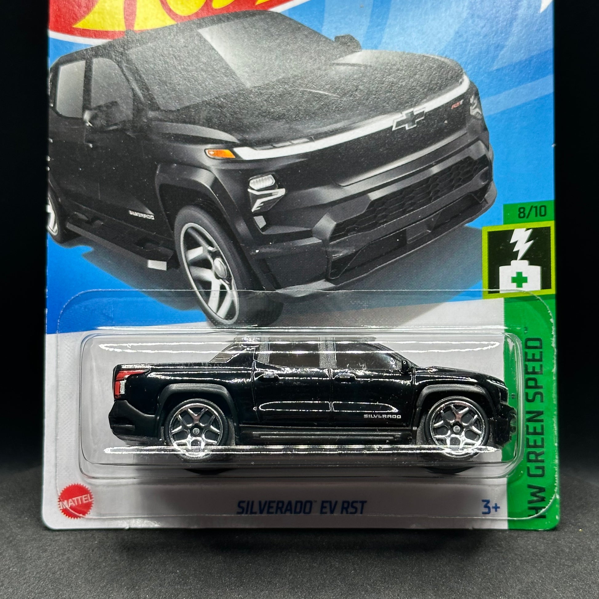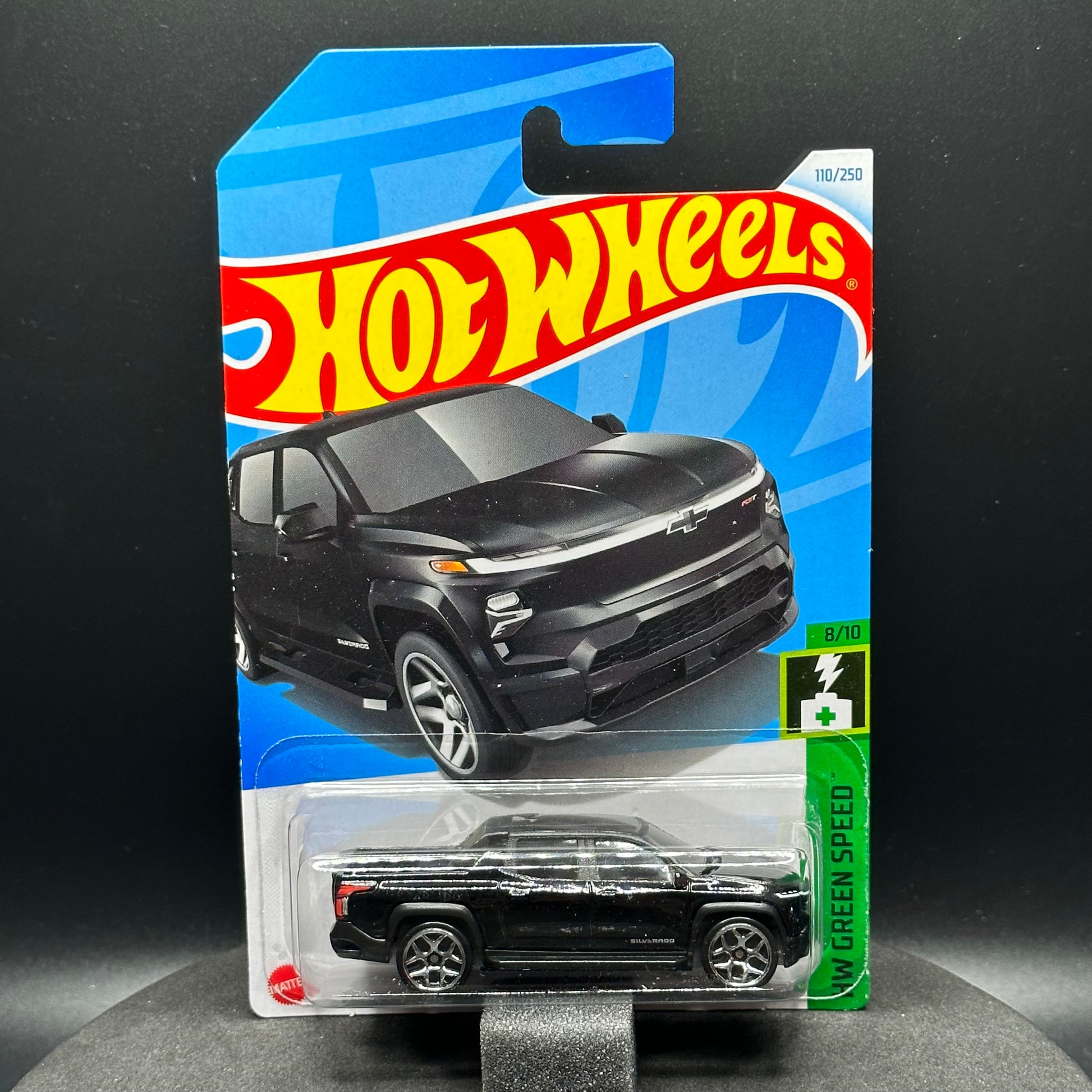 Hot Wheels Chevy Silverado EV RST in black. There are multiple available and you might not get the exact one in the picture. They are all in good condition but may have slightly soft corners or lightly dented edges. All Hot Wheels will be individually wrapped in bubble wrap and shipped in a box for added protection.