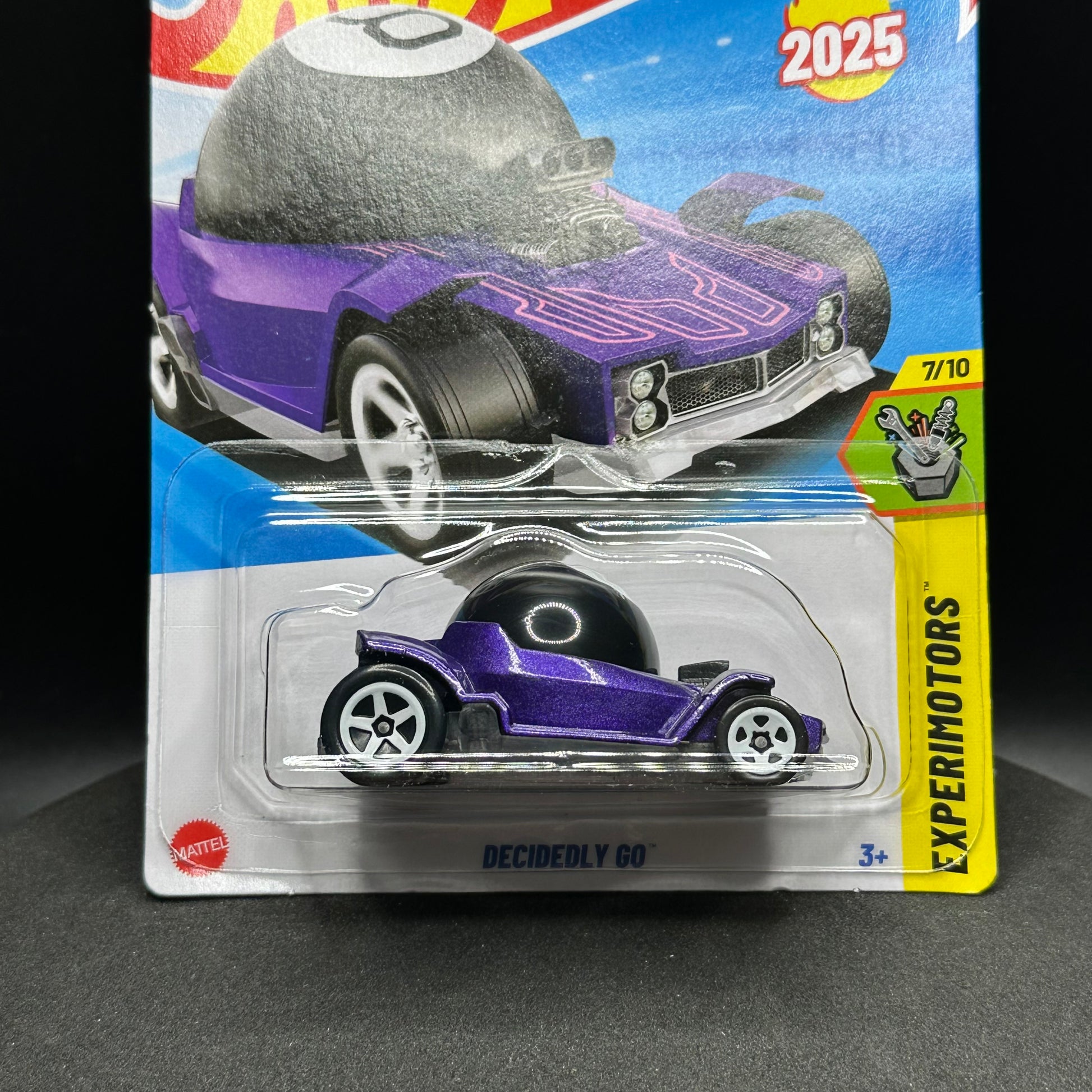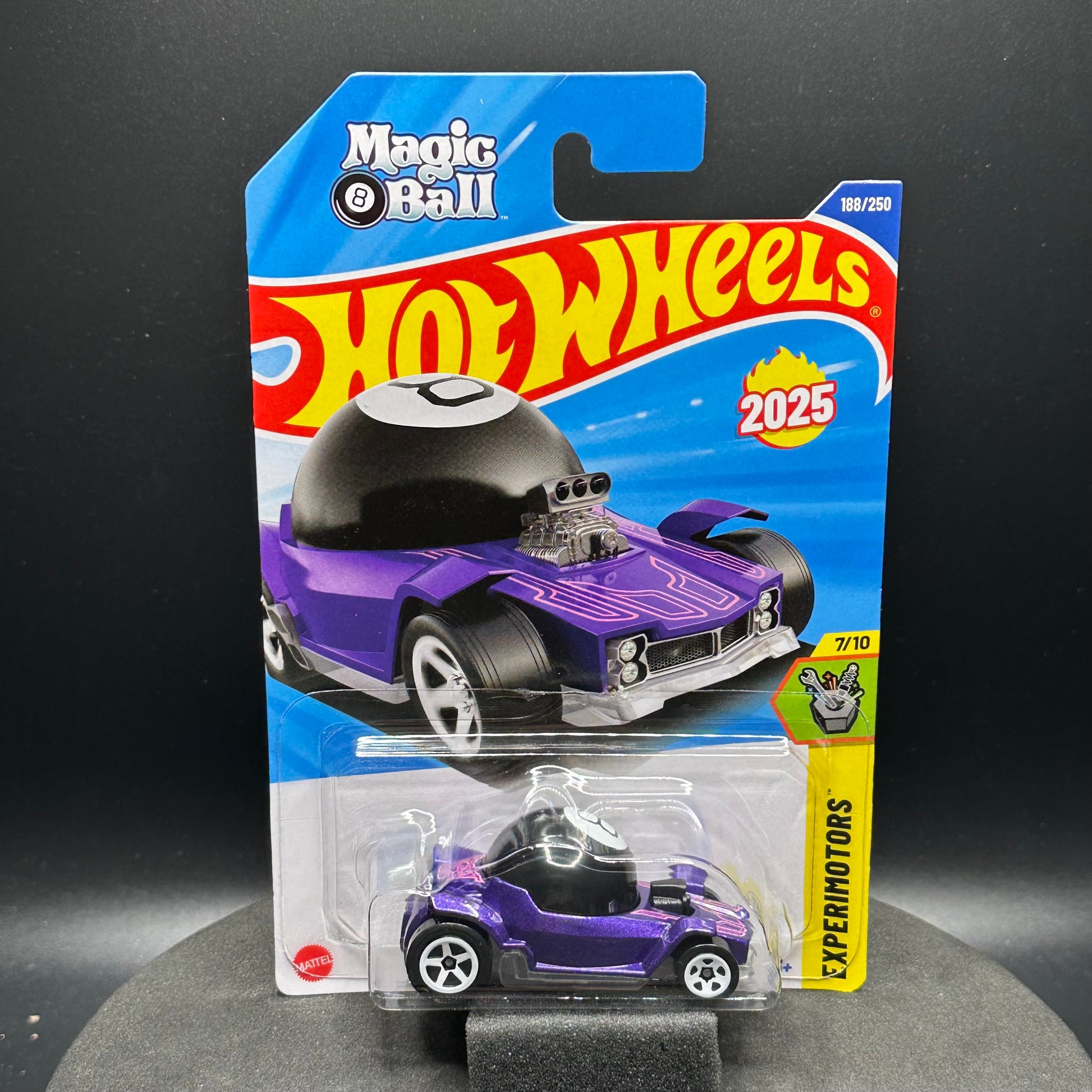Hot Wheels Decidedly Go Magic 8 Ball with functioning part inside that works just like a Magic 8 Ball just without the liquid. There are multiple available and you might not get the exact one in the picture. They are all in good condition but may have slightly soft corners or lightly dented edges. All Hot Wheels will be individually wrapped in bubble wrap and shipped in a box for added protection.