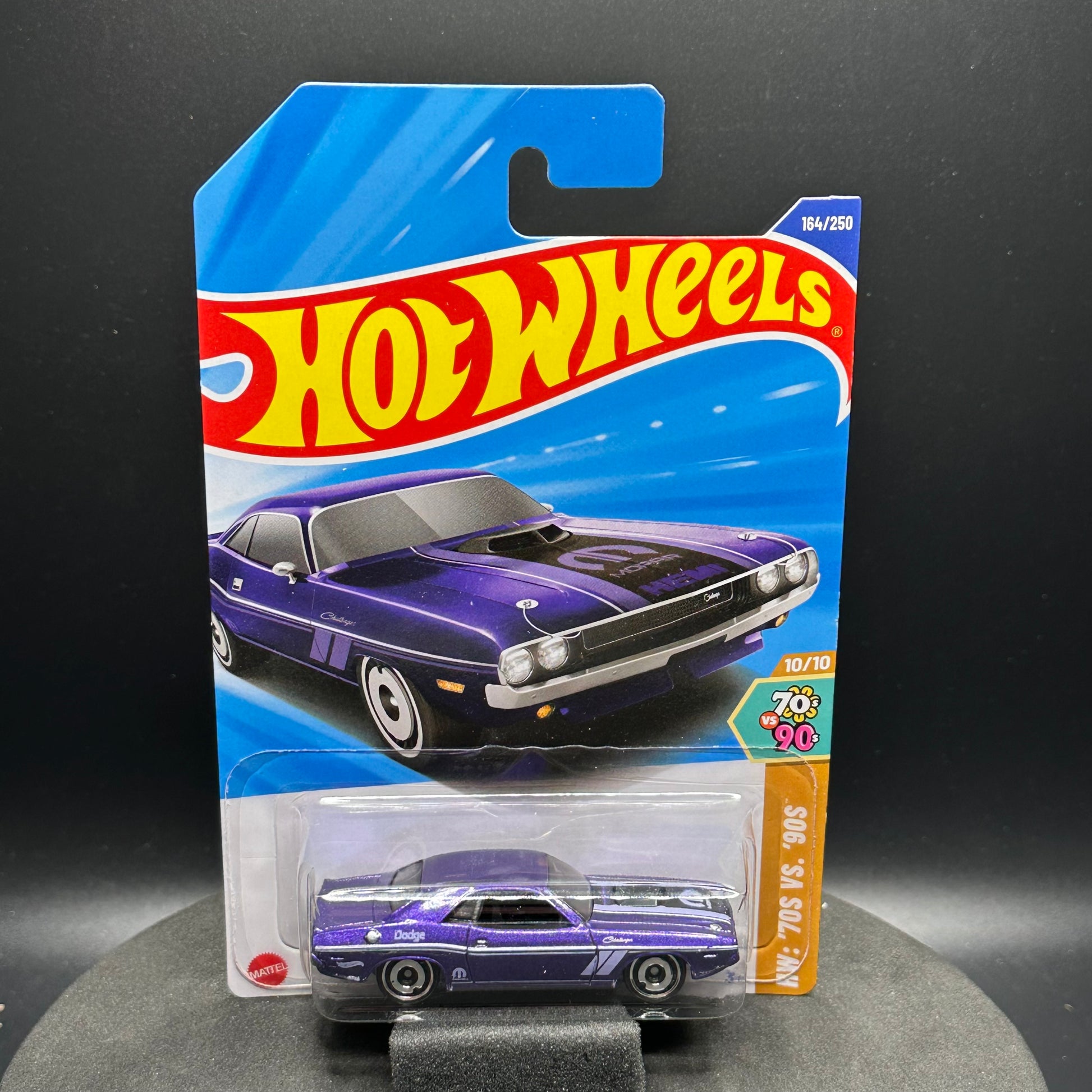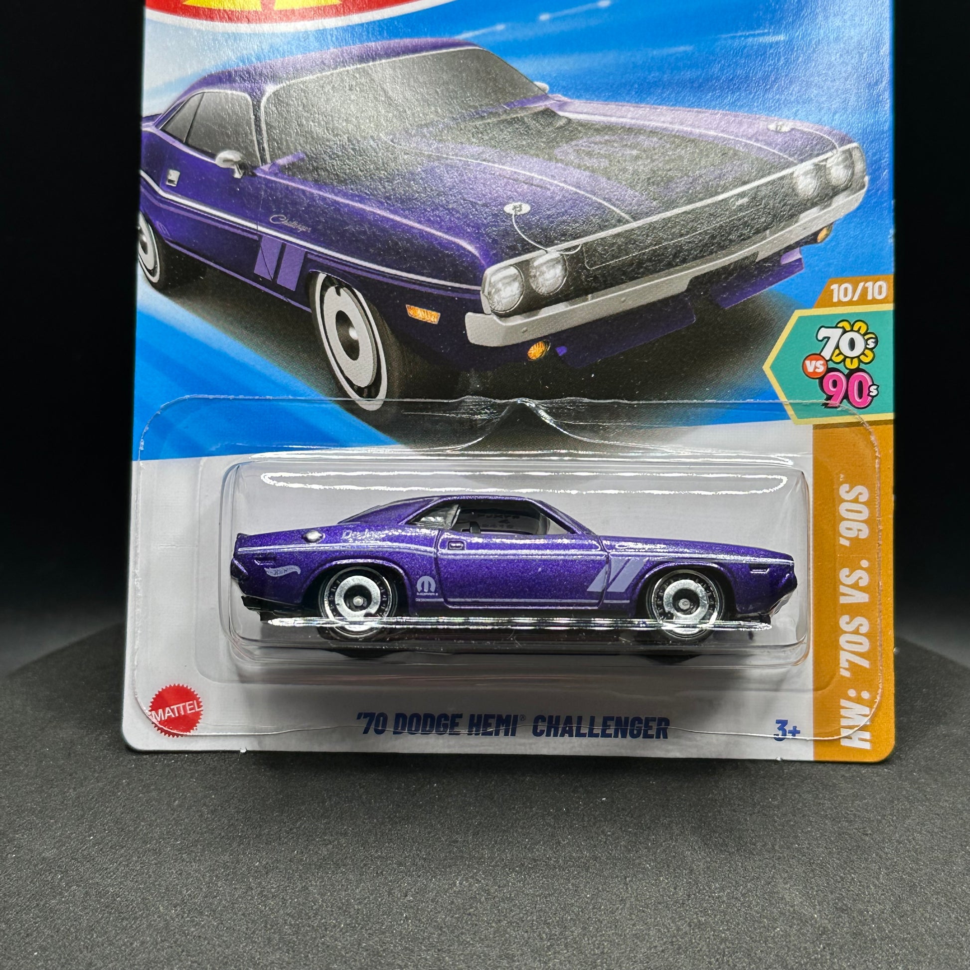 Hot Wheels ‘70 Dodge Hemi Challenger in purple. There are multiple available and you might not get the exact one in the picture. They are all in good condition but may have slightly soft corners or lightly dented edges. All Hot Wheels will be individually wrapped in bubble wrap and shipped in a box for added protection.