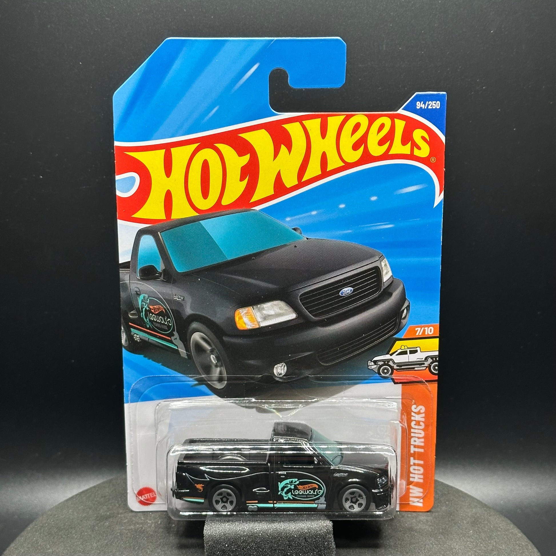 Hot Wheels ‘99 Ford F150 SVT Lightning in black. There are multiple available and you might not get the exact one in the picture. They are all in good condition but may have slightly soft corners or lightly dented edges. All Hot Wheels will be individually wrapped in bubble wrap and shipped in a box for added protection.