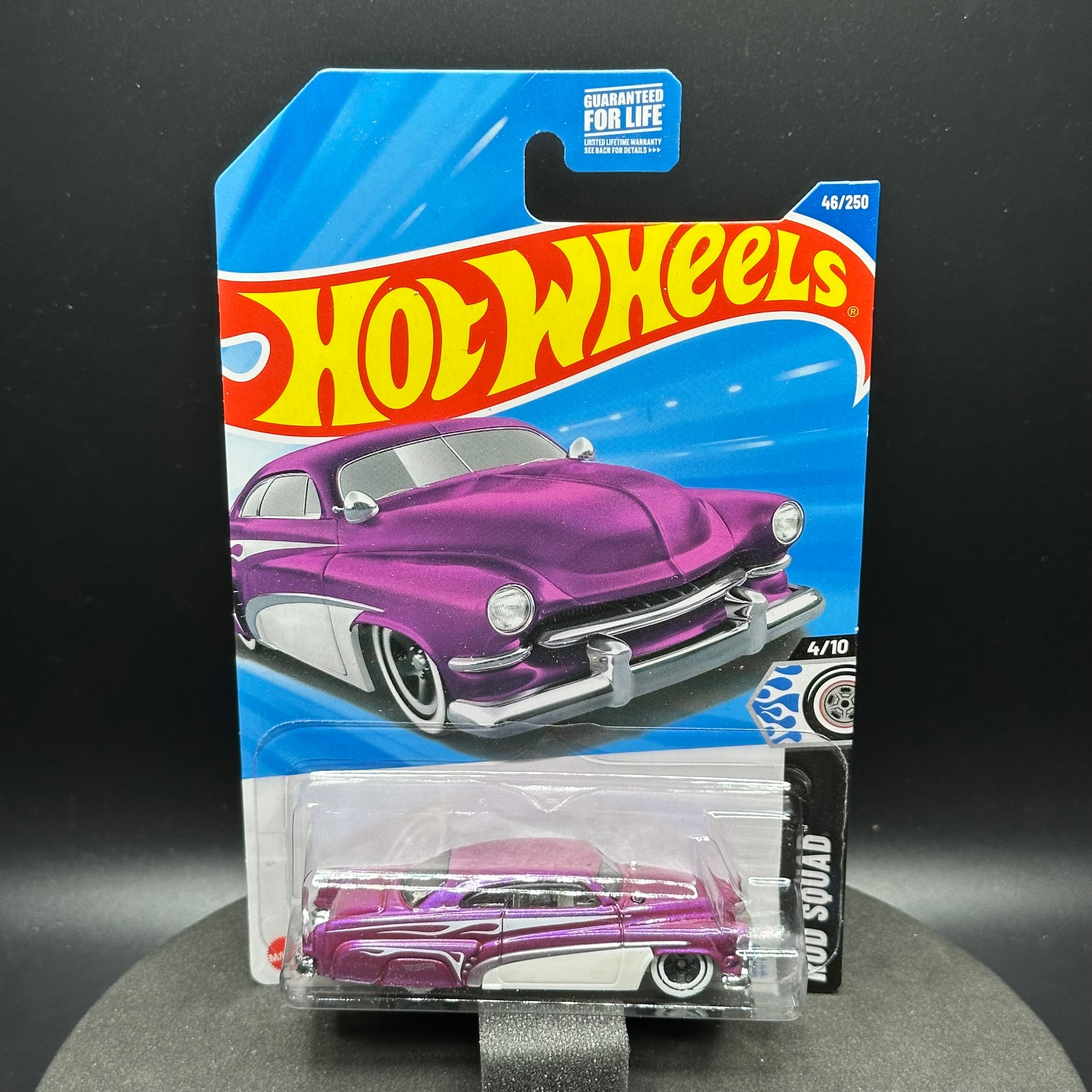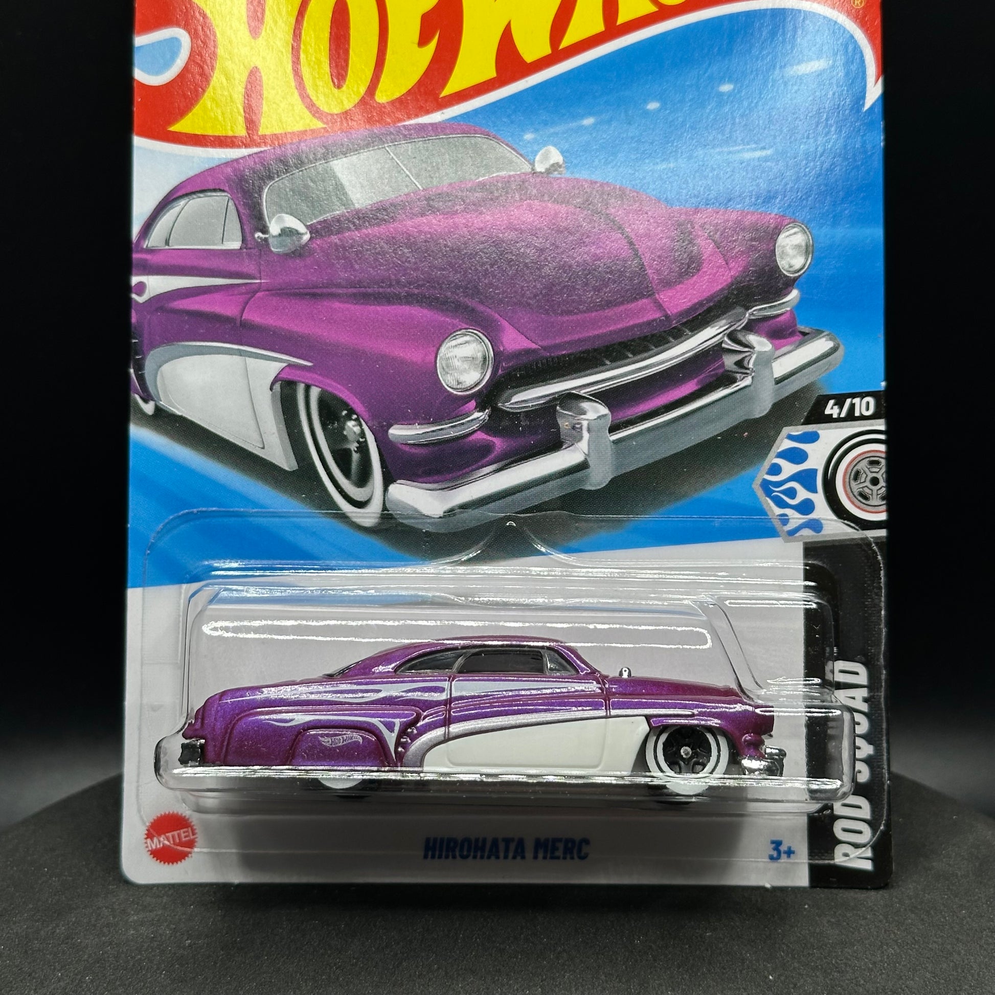 Hot Wheels Hirohata Merc in purple. There are multiple available and you might not get the exact one in the picture. They are all in good condition but may have slightly soft corners or lightly dented edges. All Hot Wheels will be individually wrapped in bubble wrap and shipped in a box for added protection.