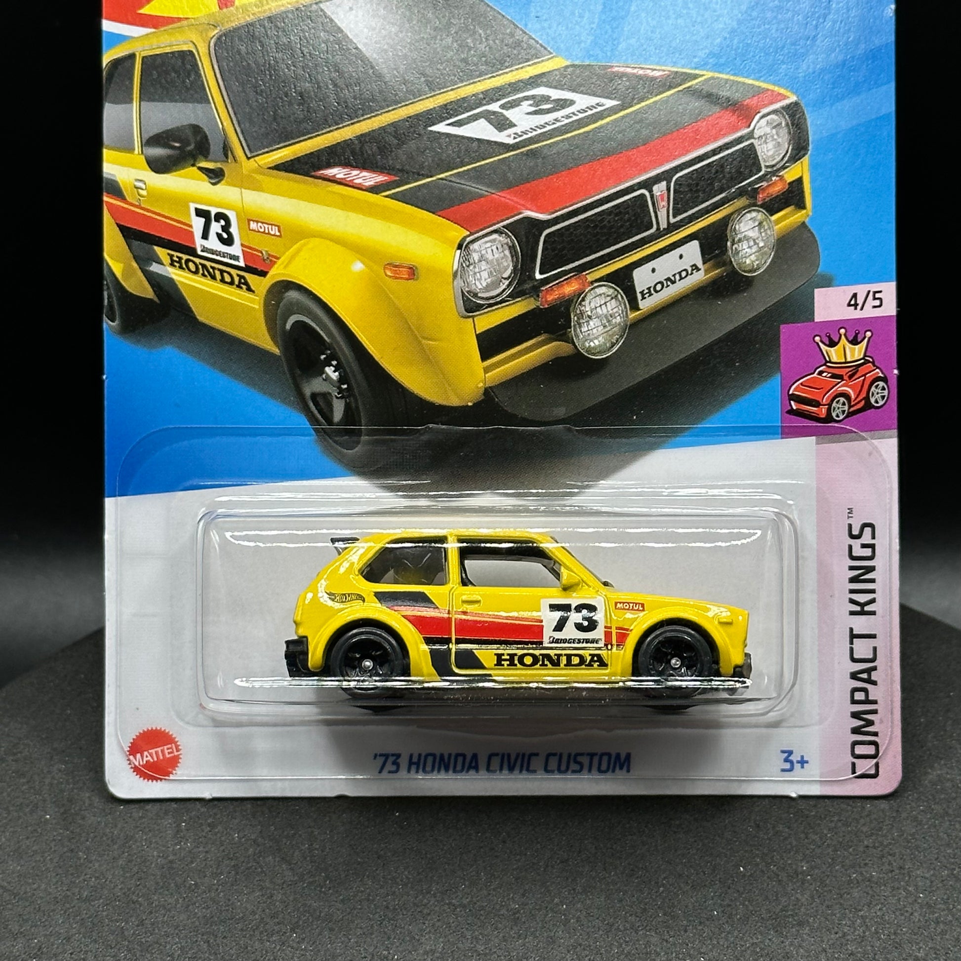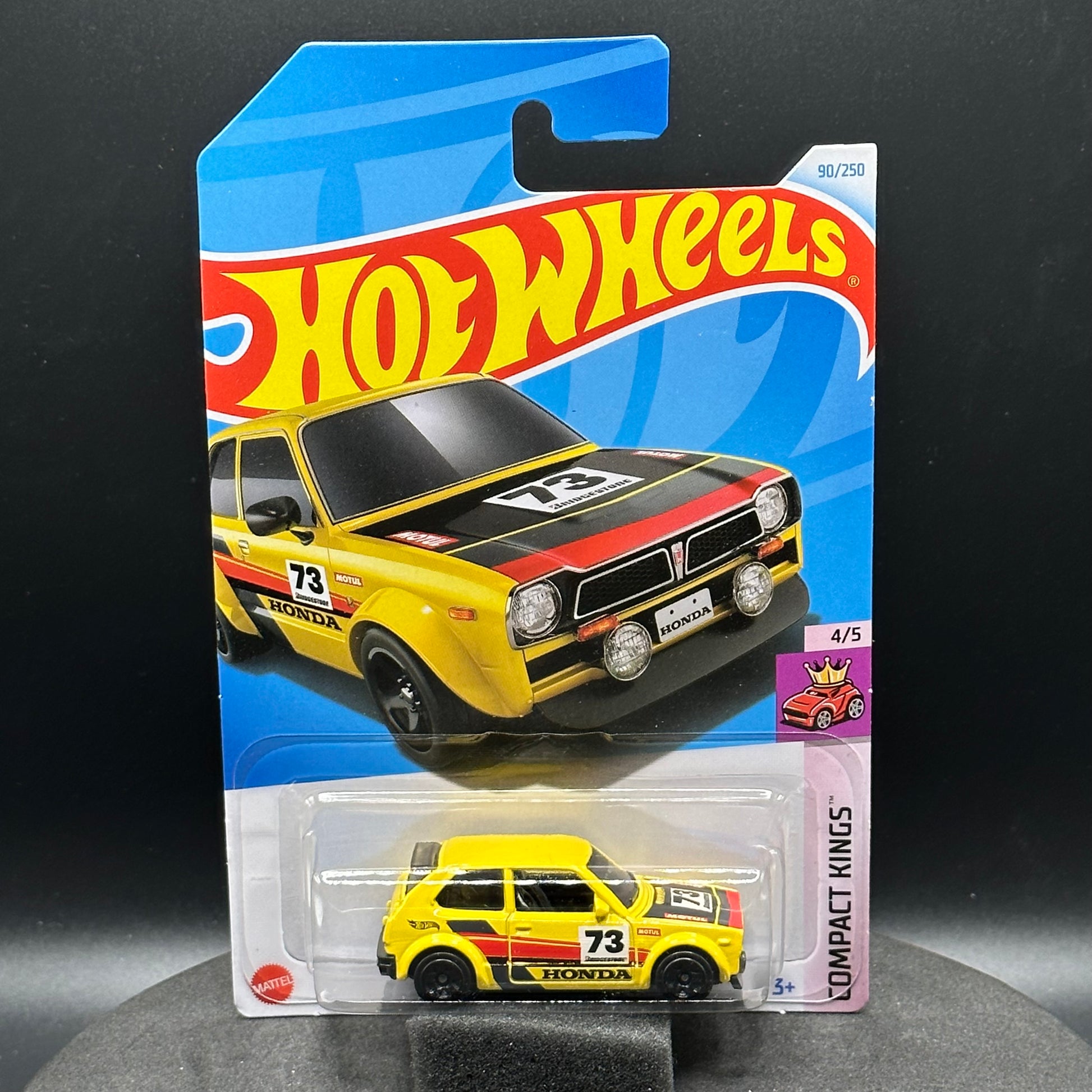 Hot Wheels ‘73 Honda Civic Custom in yellow with decals. There are multiple available and you might not get the exact one in the picture. They are all in good condition but may have slightly soft corners or lightly dented edges. All Hot Wheels will be wrapped in bubble wrap and shipped in a box for added protection.