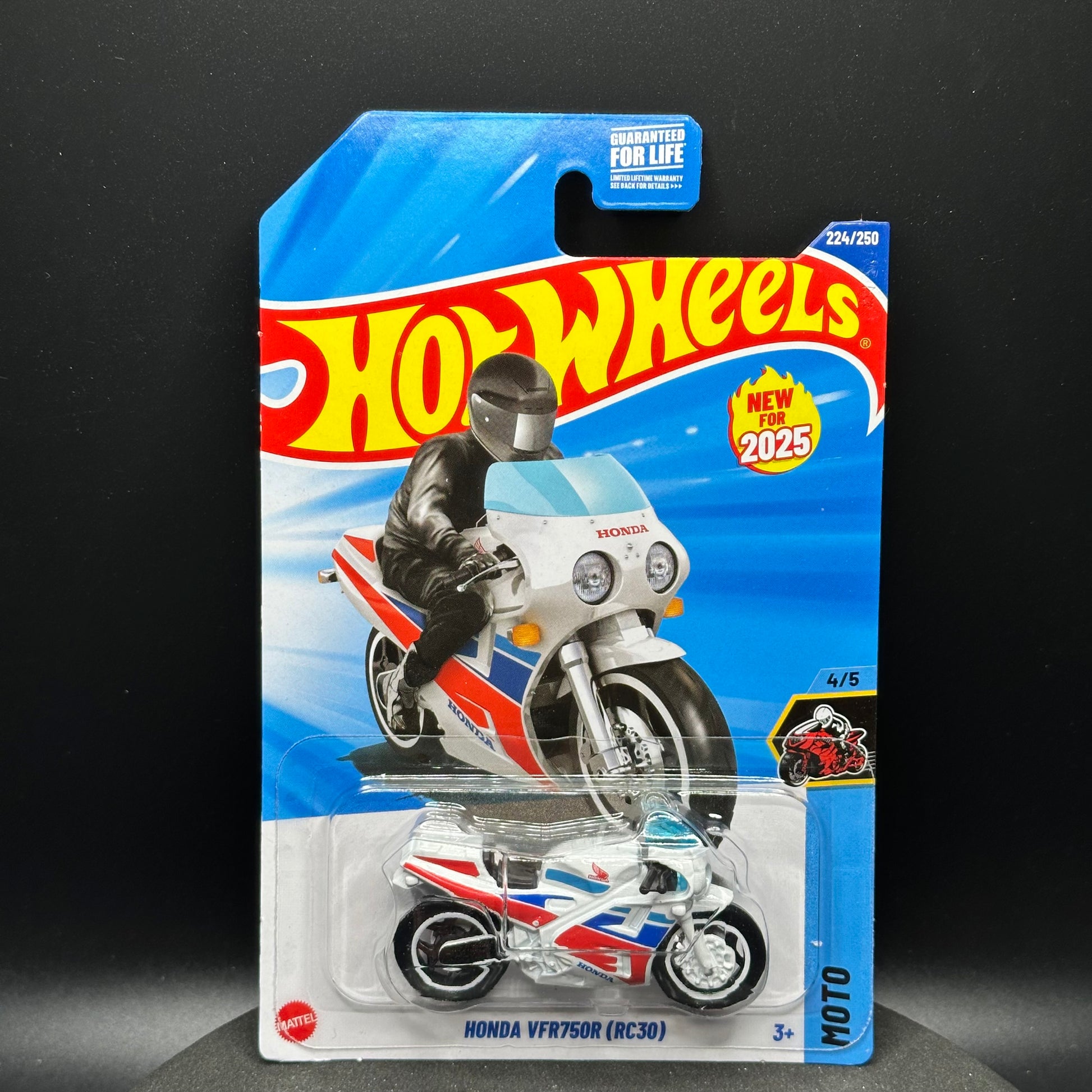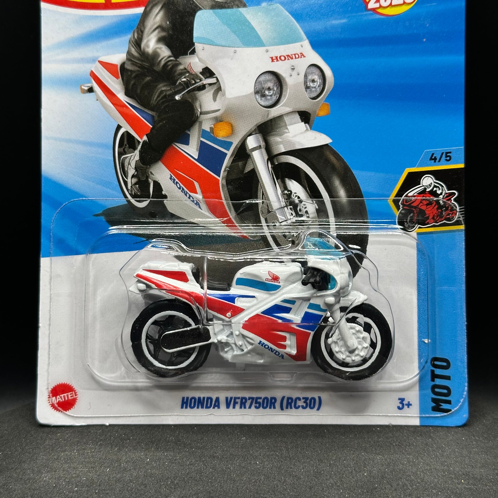 Hot Wheels Honda VFR750R motorcycle in white. There are multiple available and you might not get the exact one in the picture. They are all in good condition but may have slightly soft corners or lightly dented edges. All Hot Wheels will be individually wrapped in bubble wrap and shipped in a box for added protection.