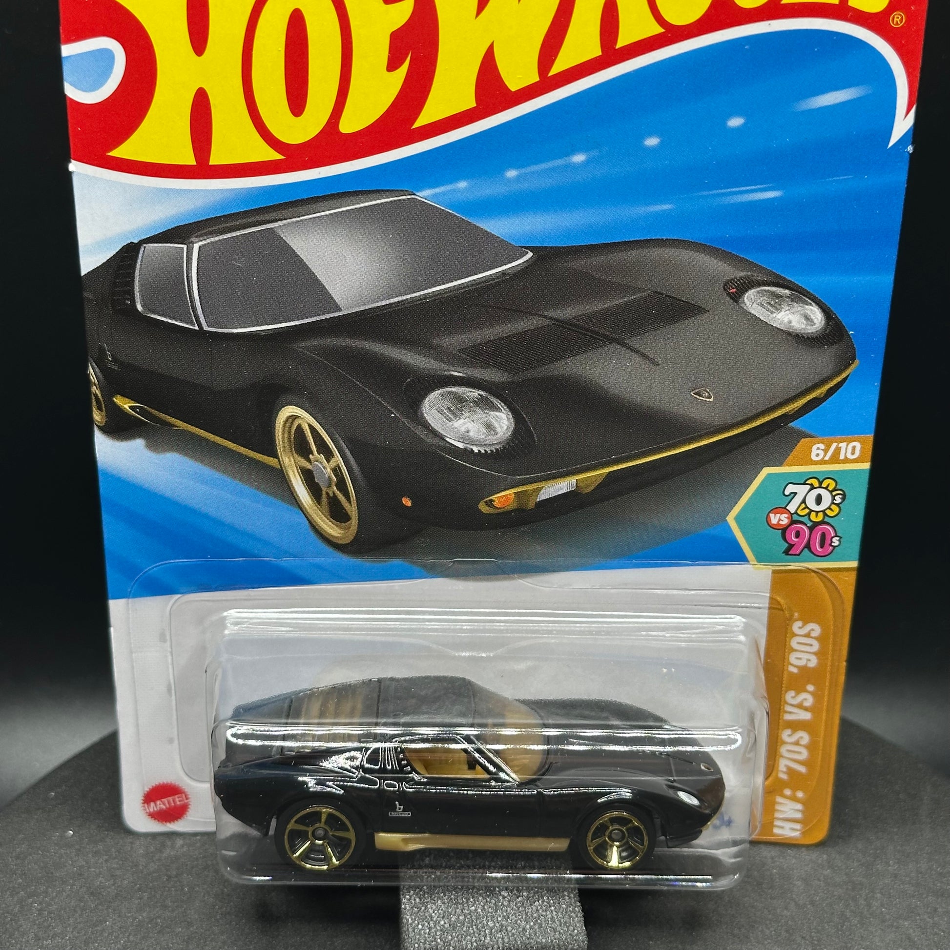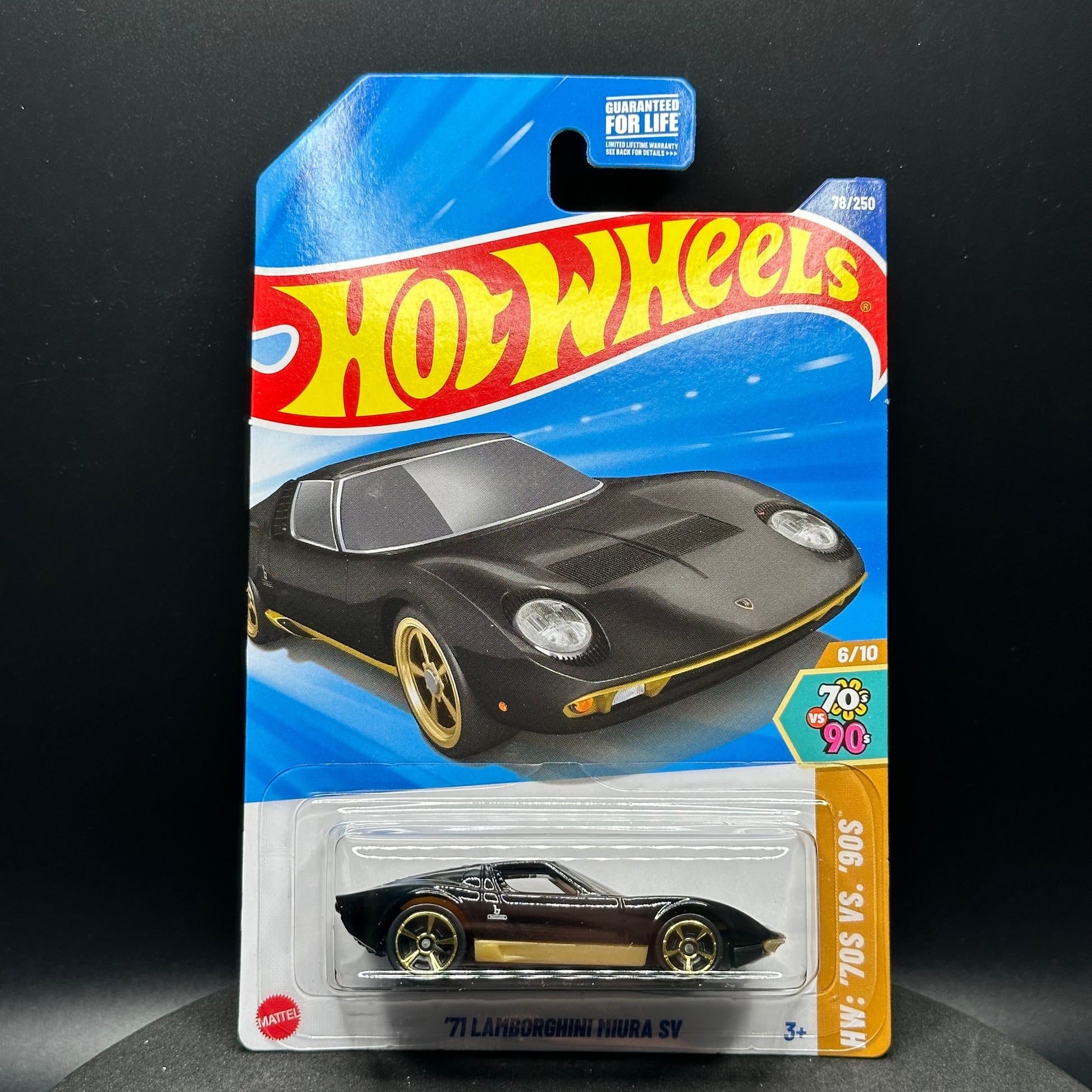 Hot Wheels ‘71 Lamborghini Miura SV in black with gold. There are multiple available and you might not get the exact one in the picture. They are all in good condition but may have slightly soft corners or lightly dented edges. All Hot Wheels will be individually wrapped in bubble wrap and shipped in a box for added protection.