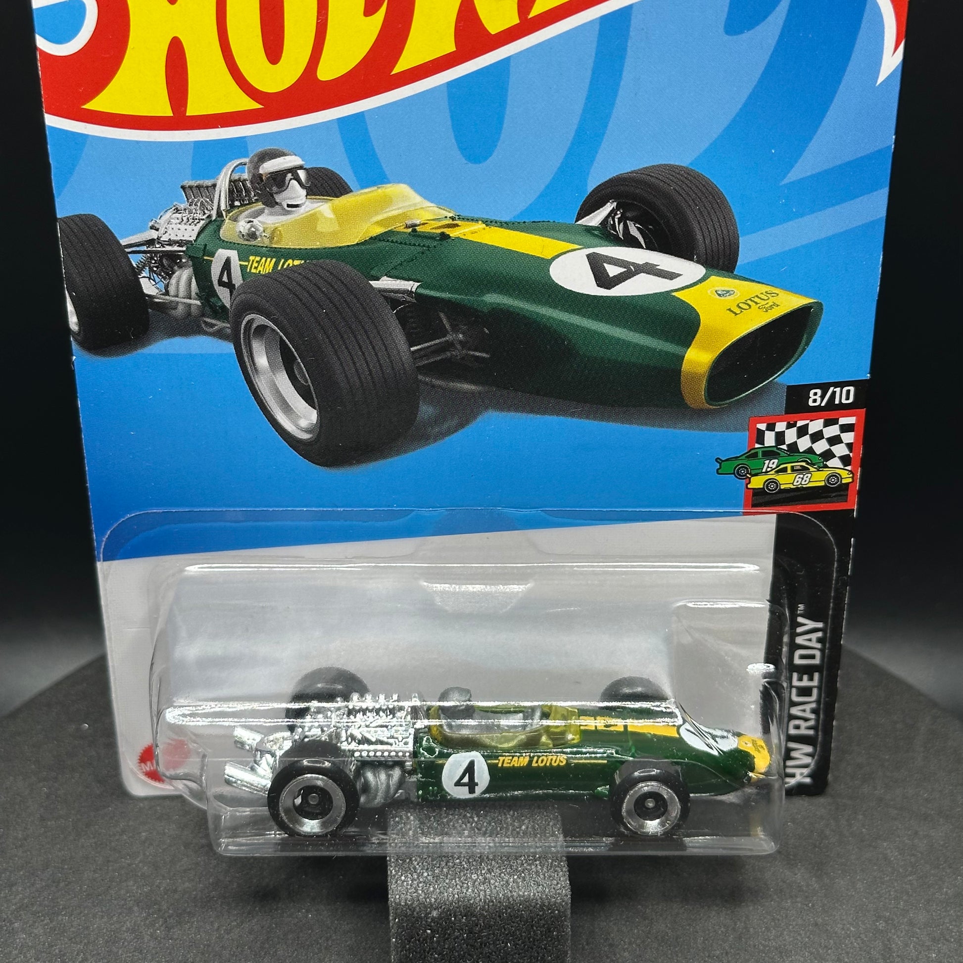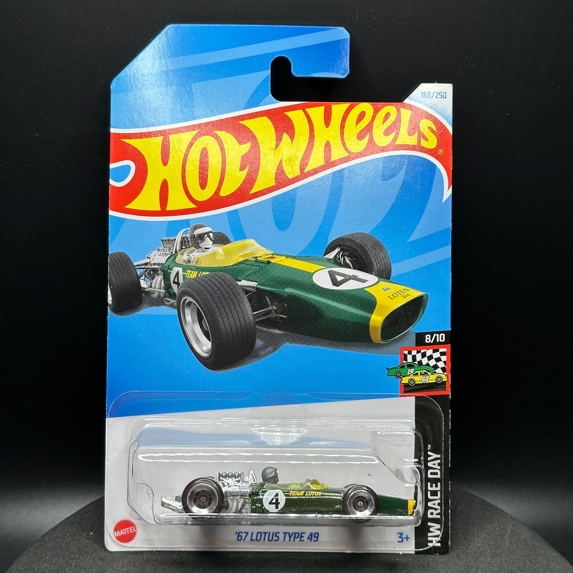 Hot Wheels ‘67 Lotus Type 49 #4 in green. There are multiple available and you might not get the exact one in the picture. They are all in good condition but may have slightly soft corners or lightly dented edges. All Hot Wheels will be individually wrapped in bubble wrap and shipped in a box for added protection.