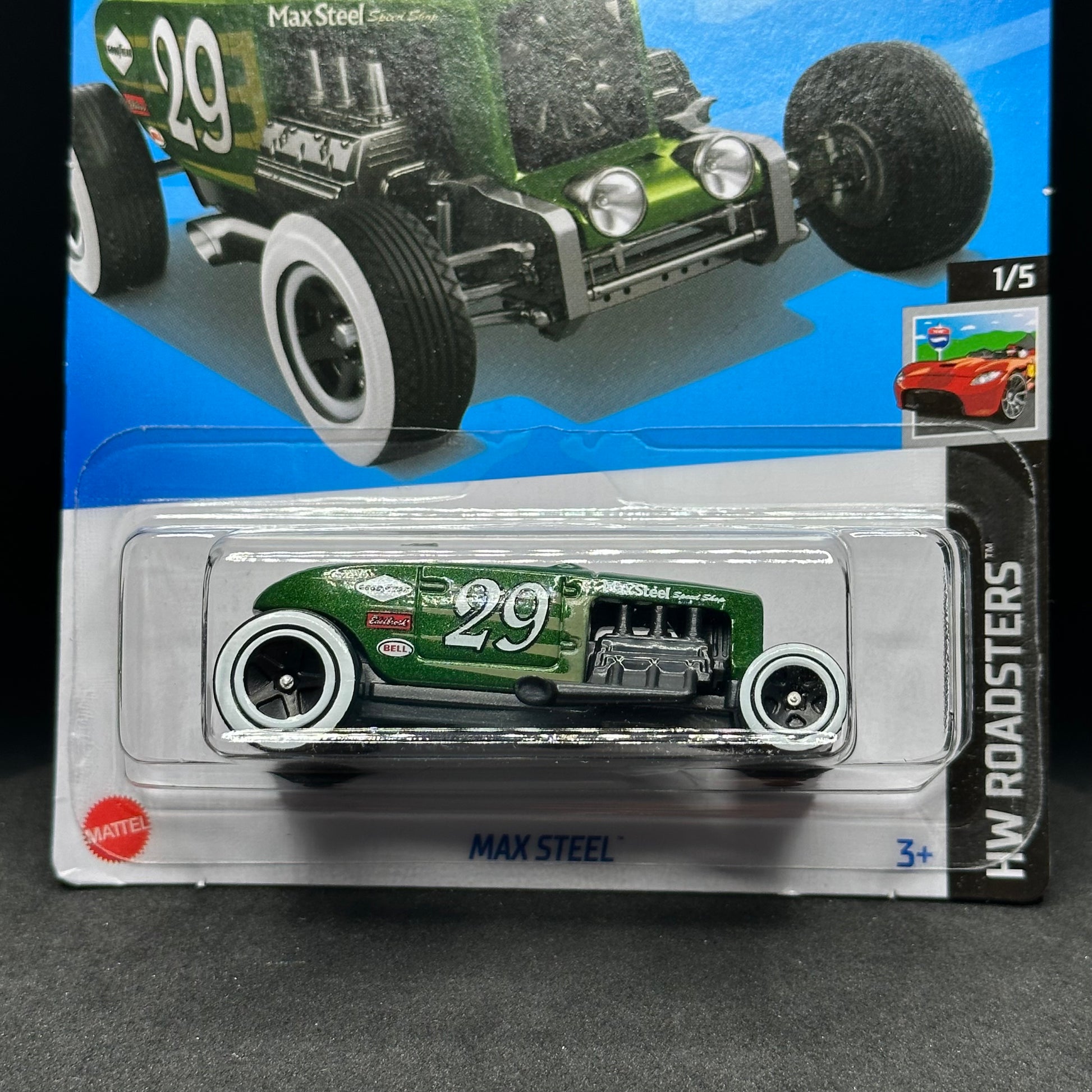 Hot Wheels Max Steel in dark green. There are multiple available and you might not get the exact one in the picture. They are all in good condition but may have slightly soft corners or lightly dented edges. All Hot Wheels will be individually wrapped in bubble wrap and shipped in a box for added protection.