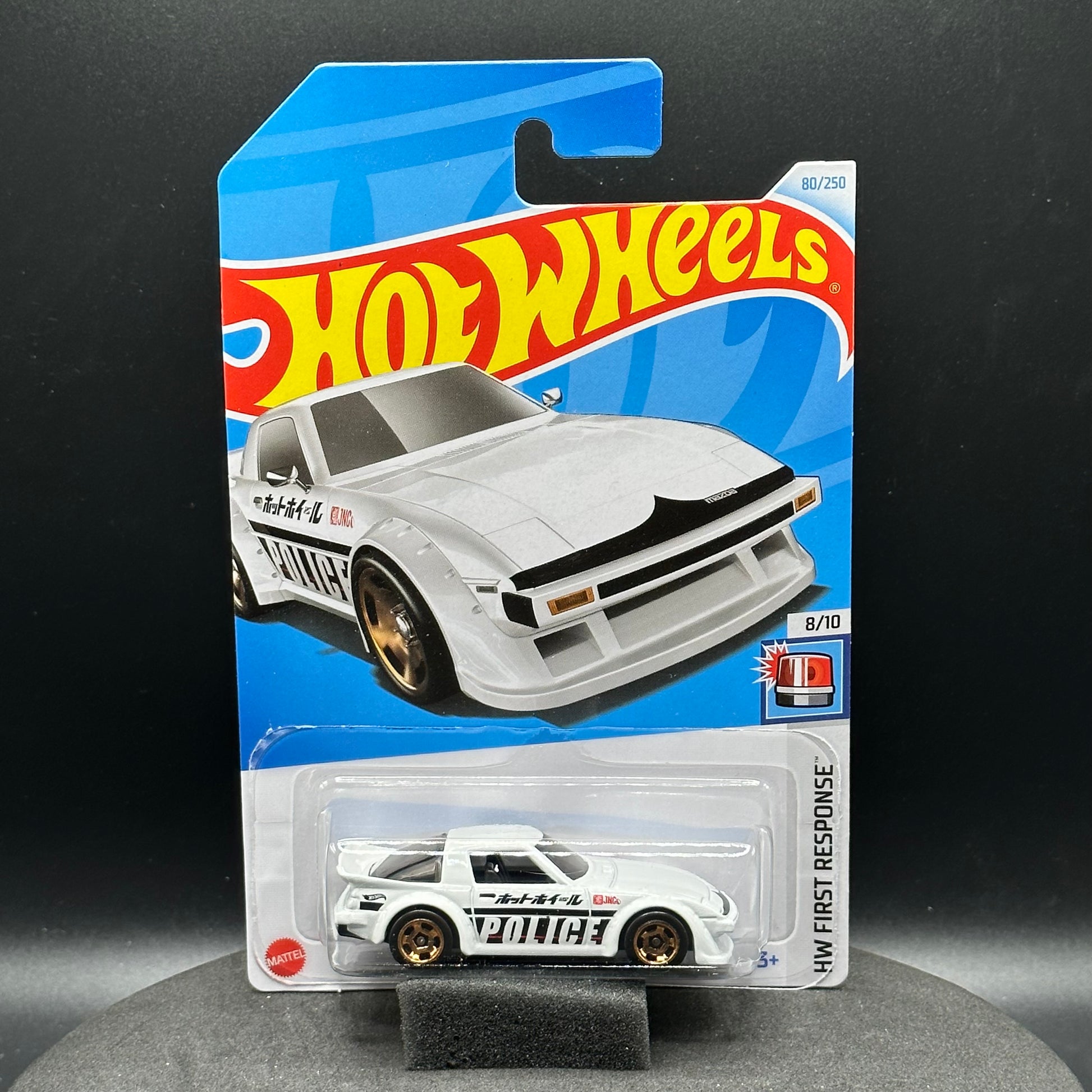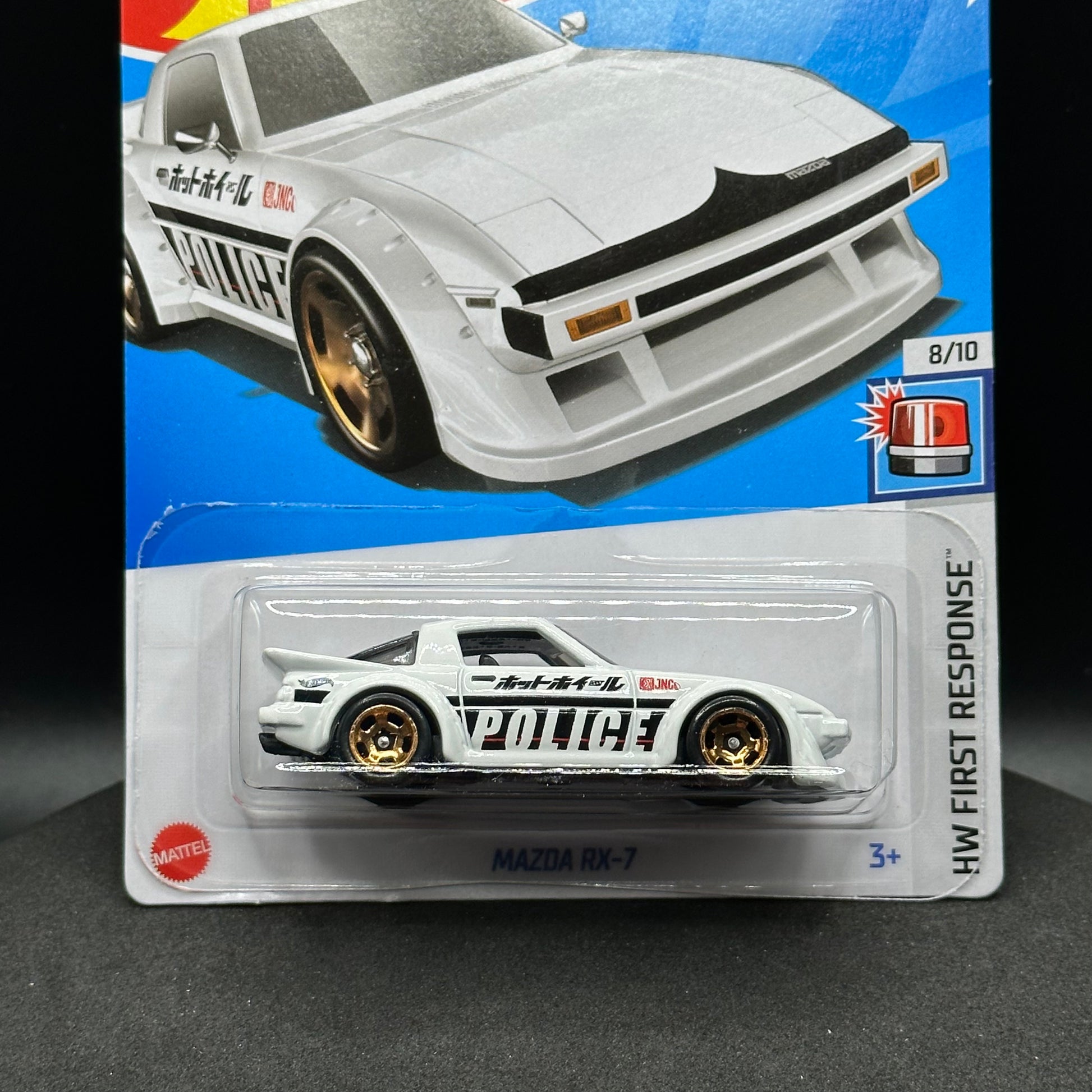 Hot Wheels a Mazda RX7 in white with Police theme. There are multiple available and you might not get the exact one in the picture. They are all in good condition but may have a slightly soft corner or slight bend on the hook. All Hot Wheels will be wrapped in bubble wrap and shipped in a box for added protection.