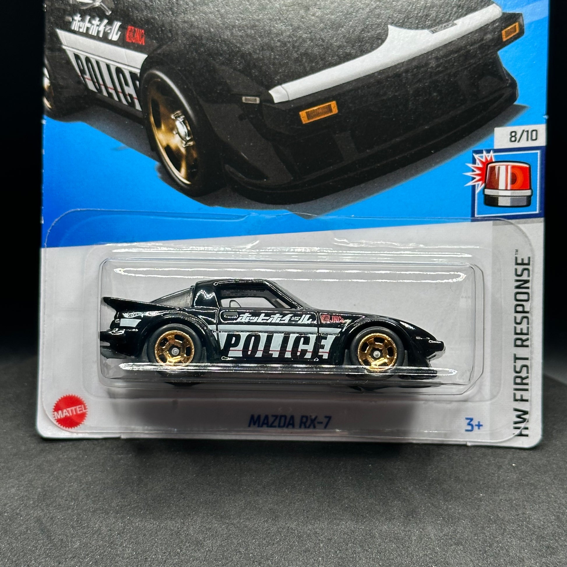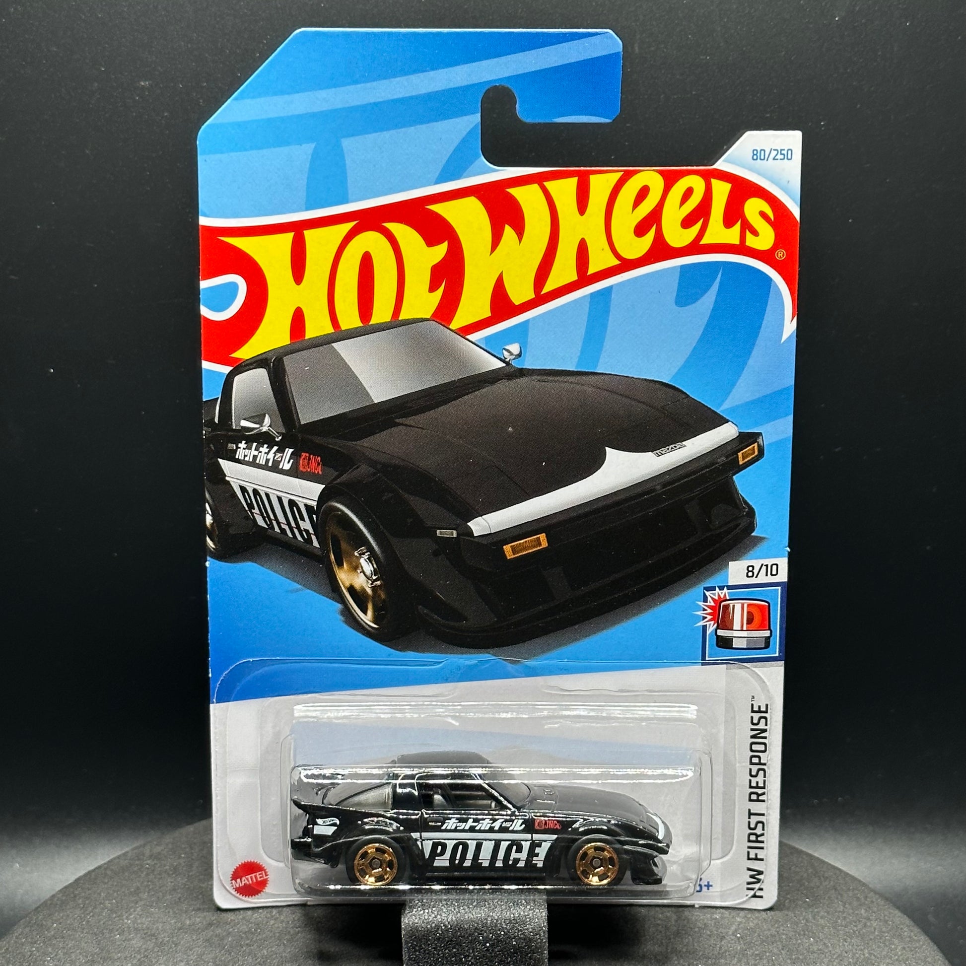 Hot Wheels Mazda RX7 police car in black. There are multiple available and you might not get the exact one in the picture. They are all in good condition but may have slightly soft corners or lightly dented edges. All Hot Wheels will be individually wrapped in bubble wrap and shipped in a box for added protection.