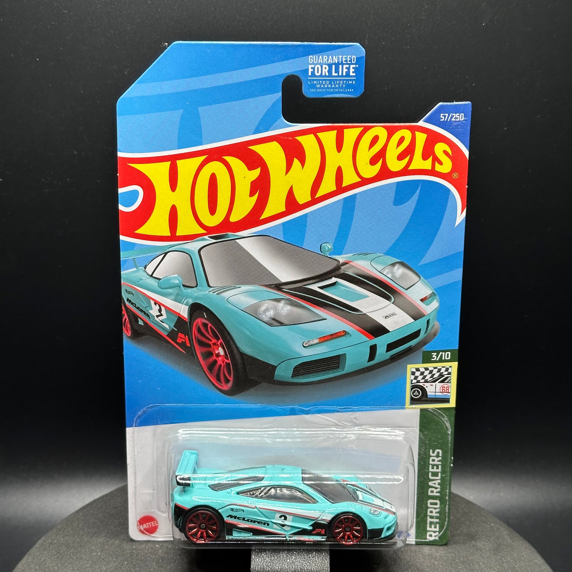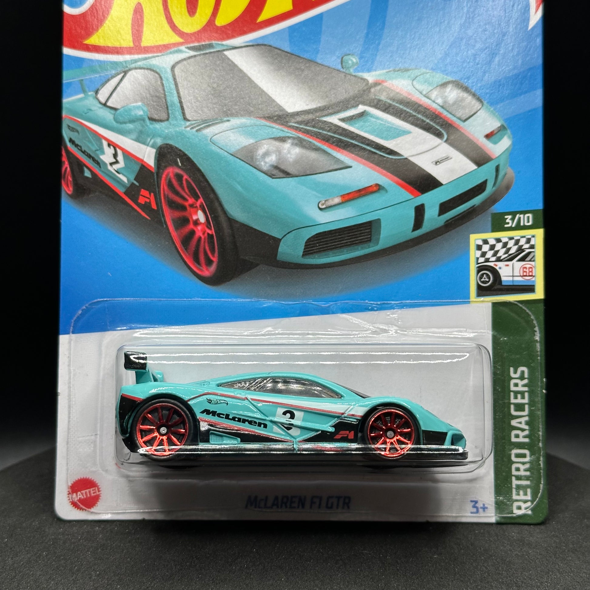 McLaren F1 GTR in teal. There are multiple available and you might not get the exact one in the picture. They are all in good condition but may have slightly soft corners or lightly dented edges. All Hot Wheels will be individually wrapped in bubble wrap and shipped in a box for added protection.