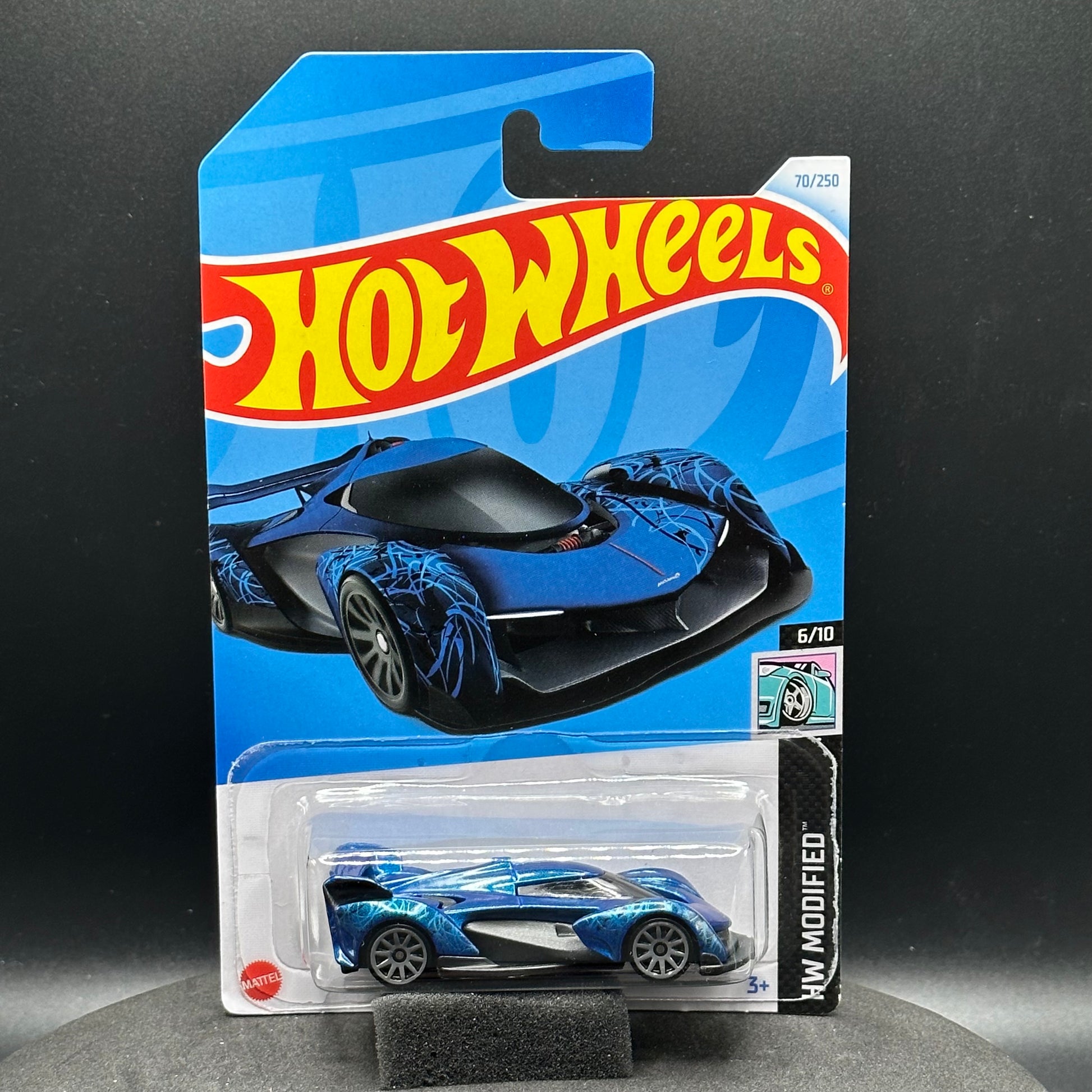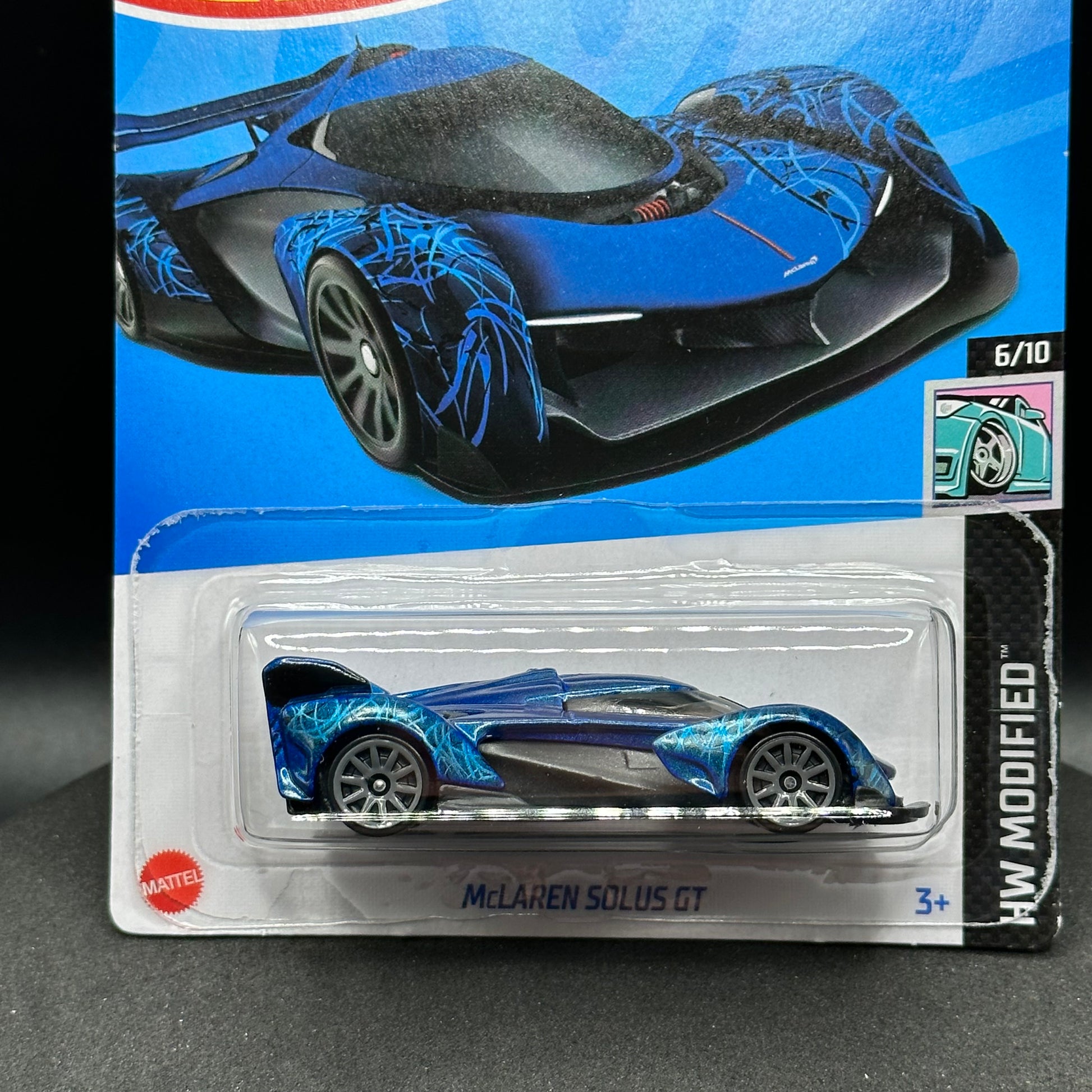Hot Wheels McLaren Solus GT in blue and black. There are multiple available and you might not get the exact one in the picture. They are all in good condition but may have a slightly soft corner or slight bend on the hook. All Hot Wheels will be wrapped in bubble wrap and shipped in a box for added protection.