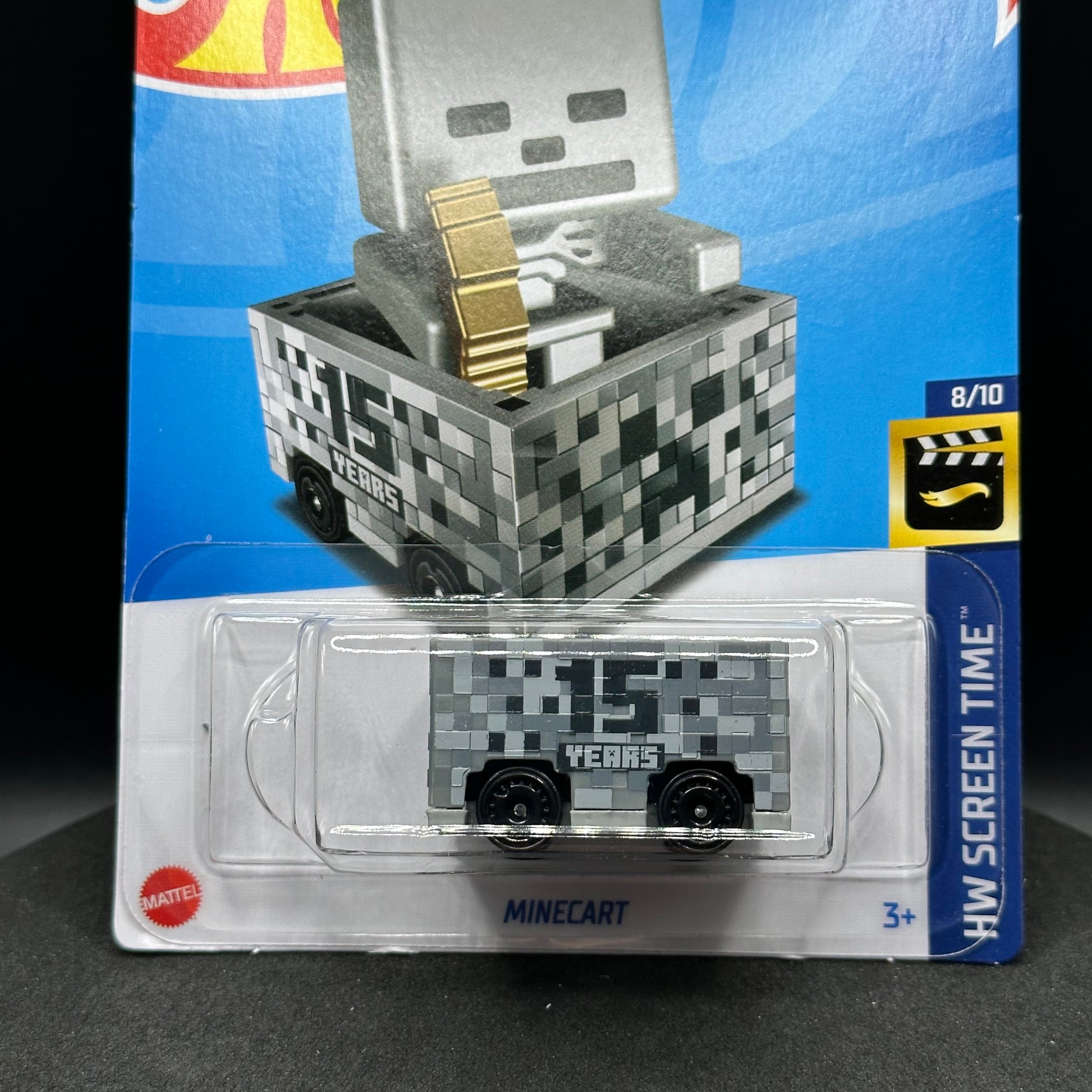 Hot Wheels Minecraft 15 Years Minecart in gray. There are multiple available and you might not get the exact one in the picture. They are all in good condition but may have slightly soft corners or lightly dented edges. All Hot Wheels will be individually wrapped in bubble wrap and shipped in a box for added protection.