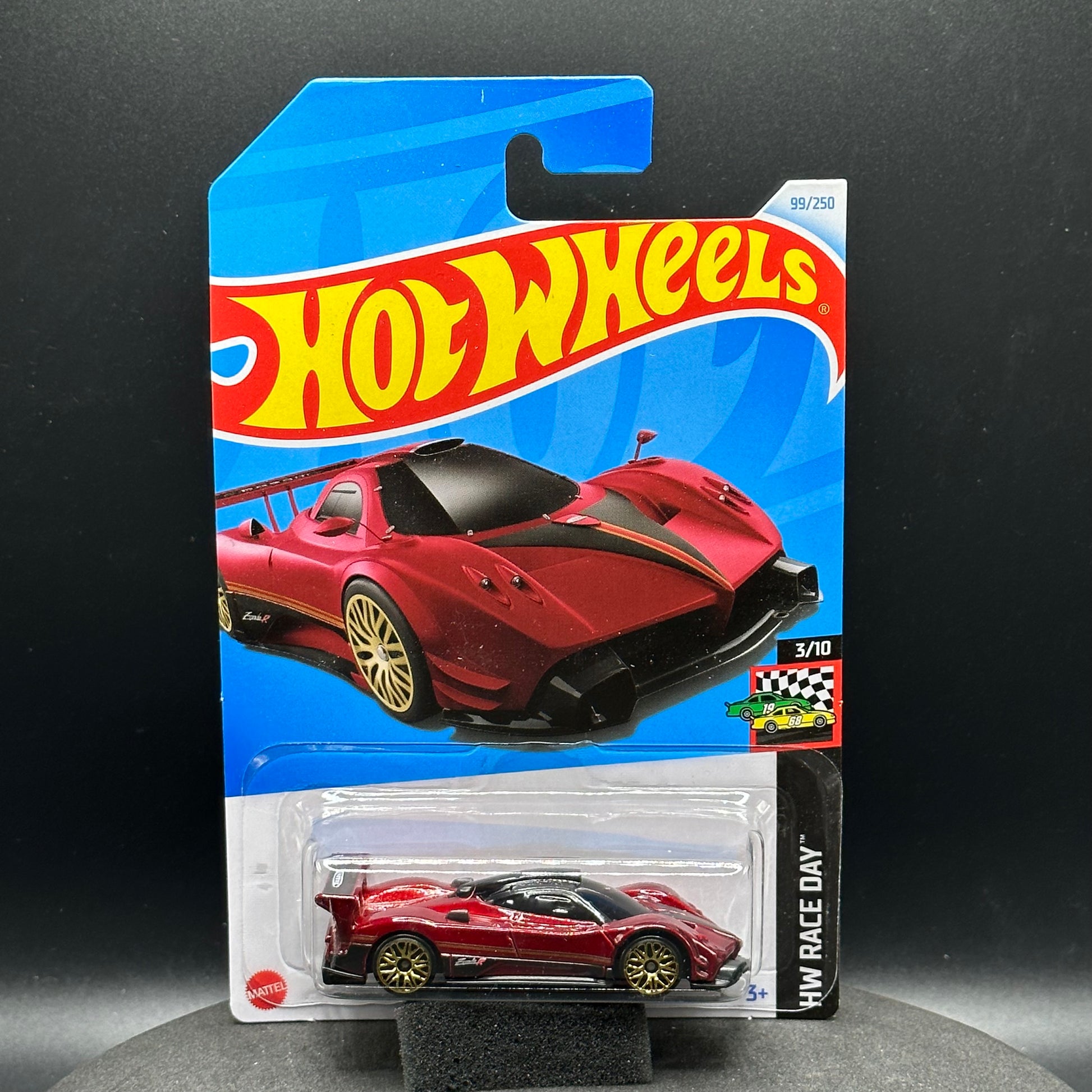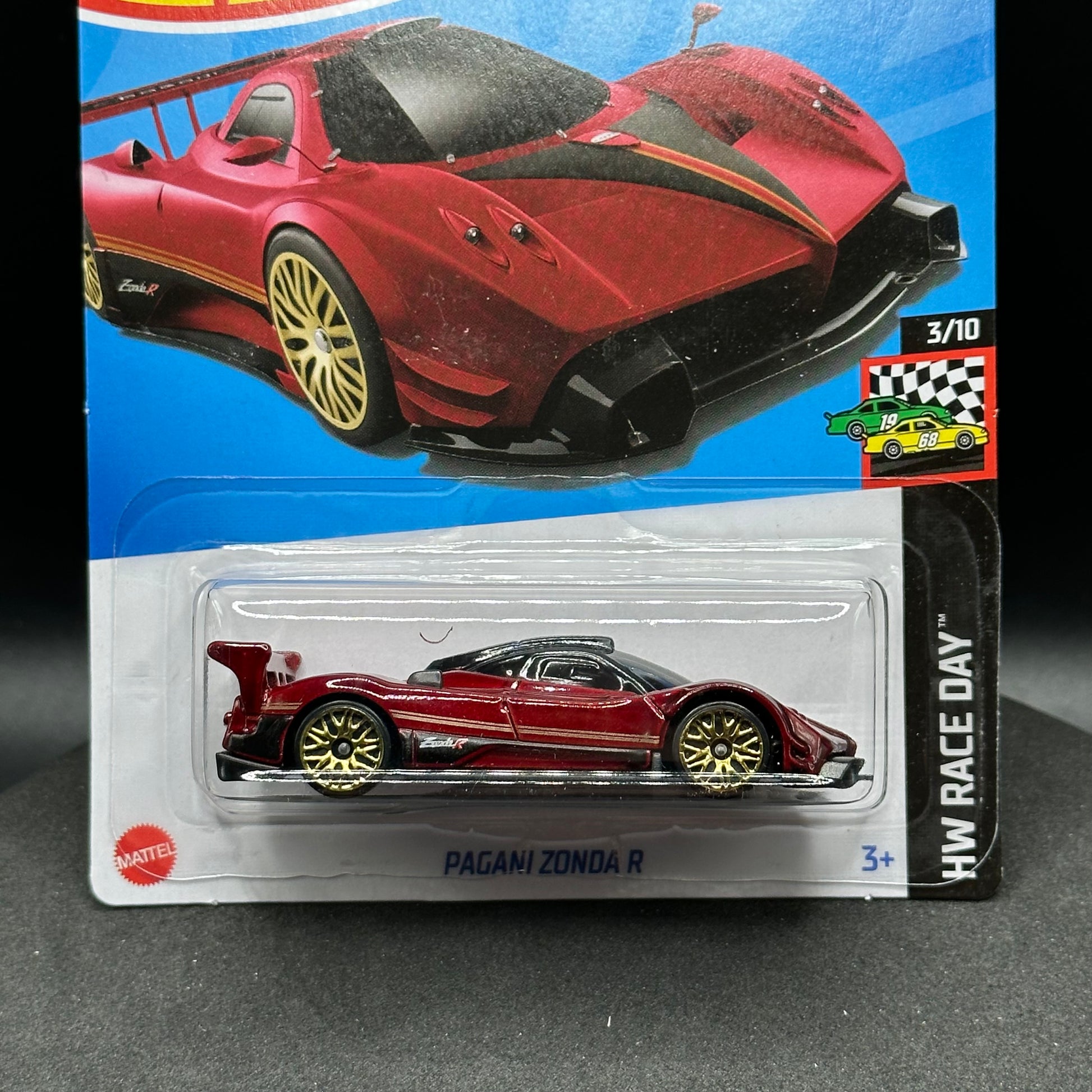 Hot Wheels Pagani Zonda R in red. There are multiple available and you might not get the exact one in the picture. They are all in good condition but may have a slightly soft corner or slight bend on the hook. All Hot Wheels will be wrapped in bubble wrap and shipped in a box for added protection.