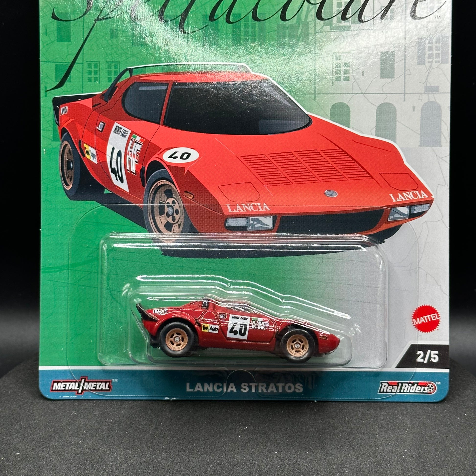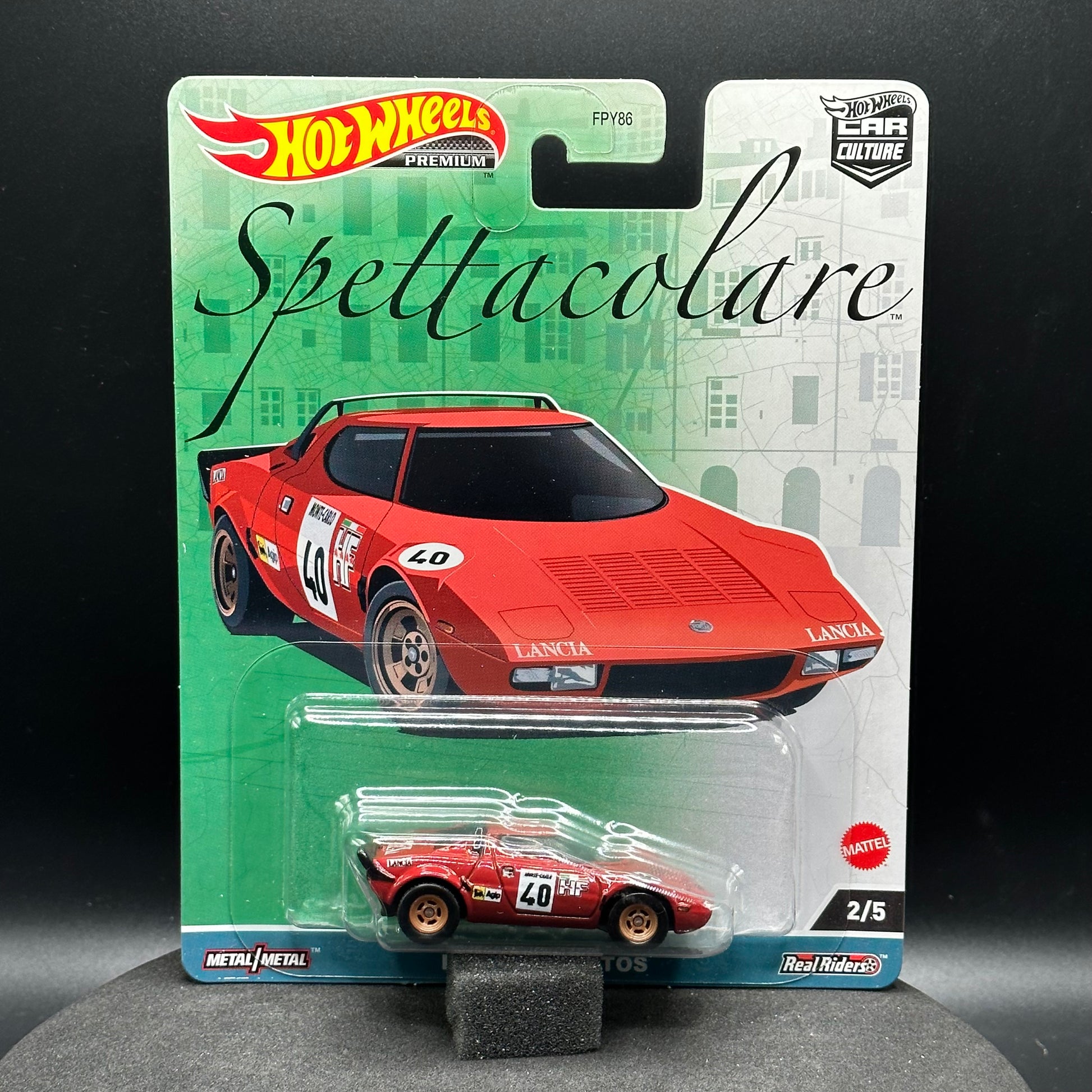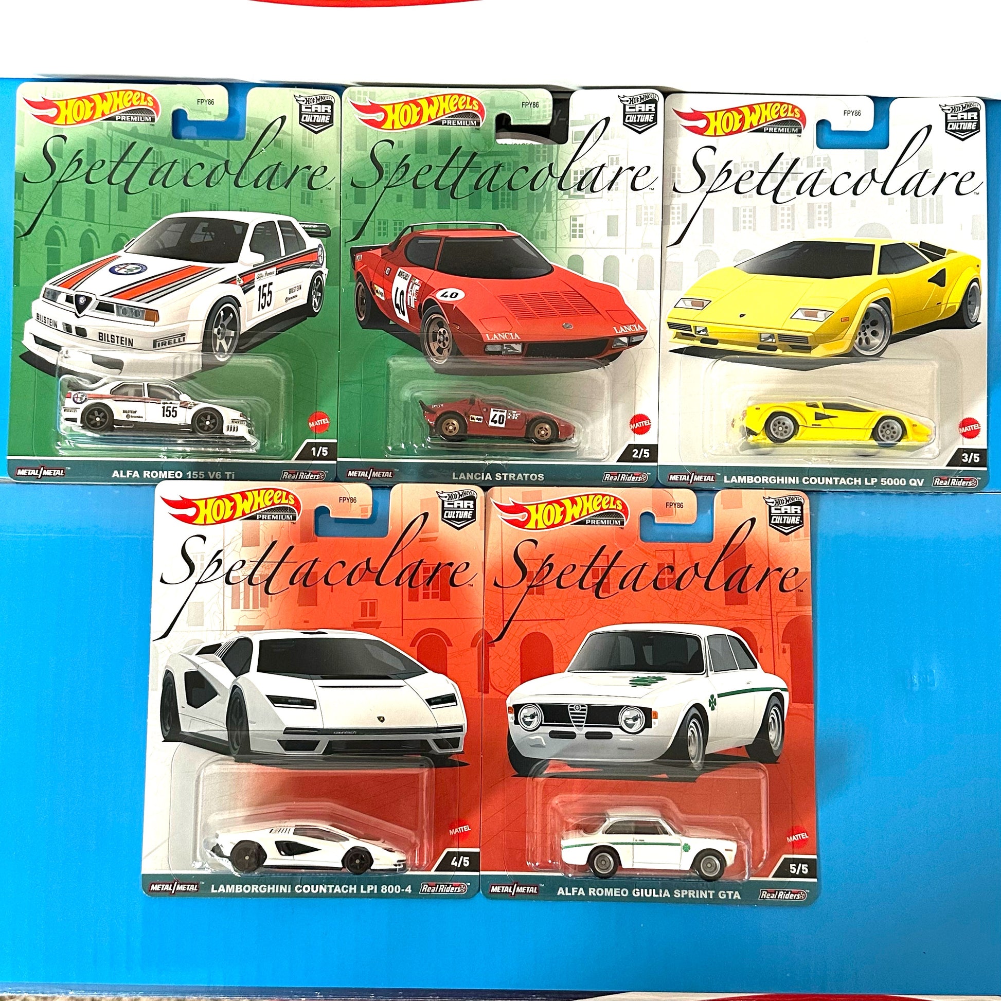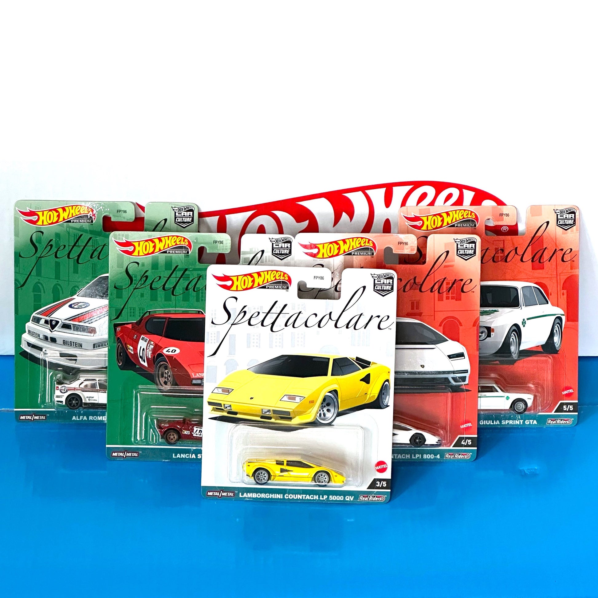 Hot Wheels Premium Car Culture Spettacolare Set. This is an all Italian car set that included Alfa Romeo 155 V6 Ti, Lancia Stratos, Lamborghini Countach LP 5000 QV, Lamborghini Countach LPI 800-4, Alfa Romeo Giulia Sprint GTA. There are multiple available and you might not get the exact one in the picture. They are all in good condition. All Hot Wheels will come wrapped in bubble wrap and shipped in a sturdy shipping box.