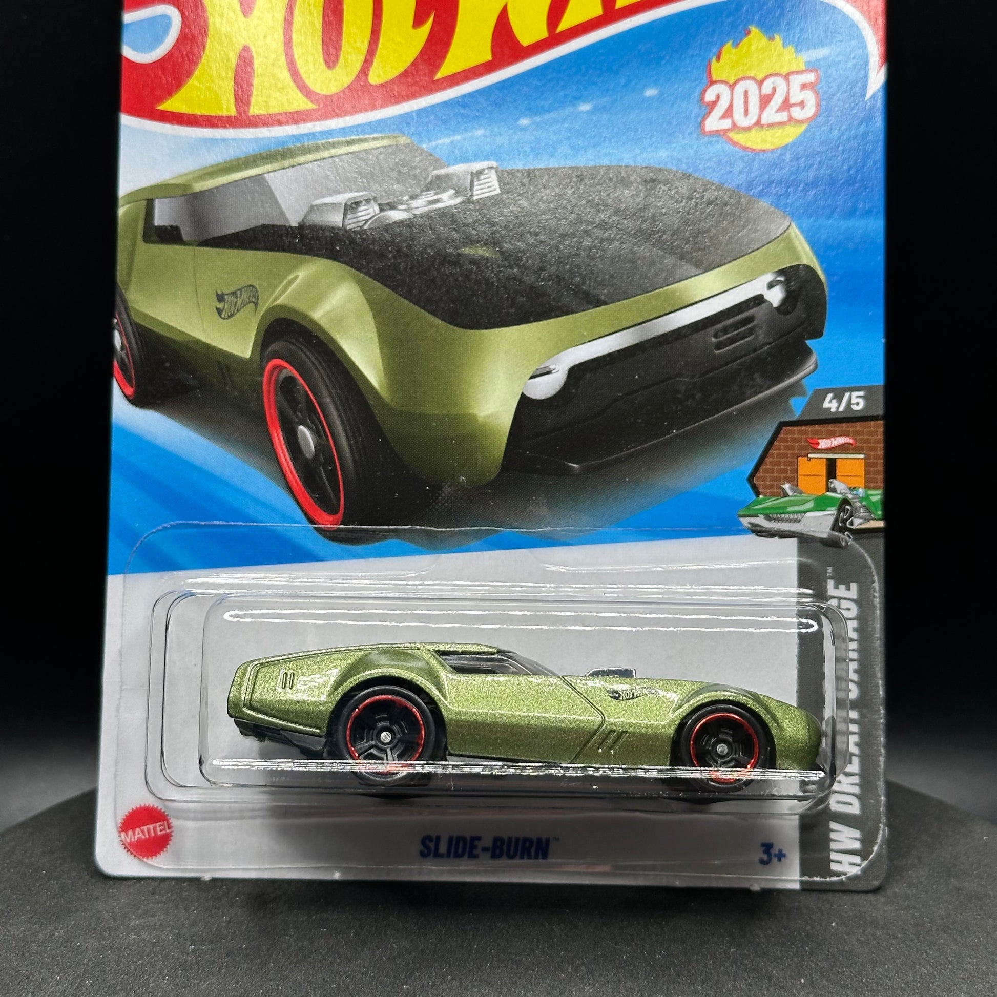 Hot Wheels Slide Burn in green. There are multiple available and you might not get the exact one in the picture. They are all in good condition but may have slightly soft corners or lightly dented edges. All Hot Wheels will be individually wrapped in bubble wrap and shipped in a box for added protection.