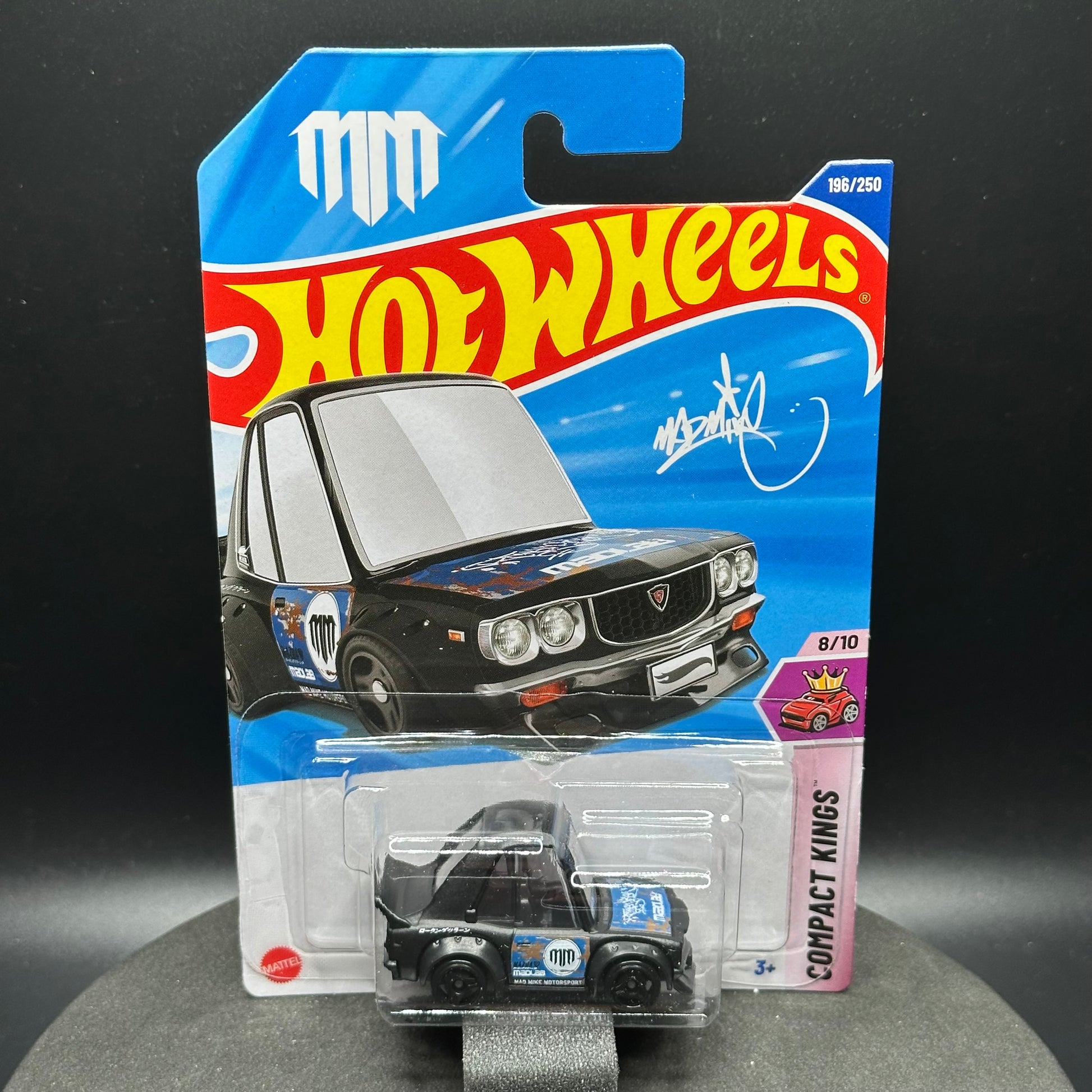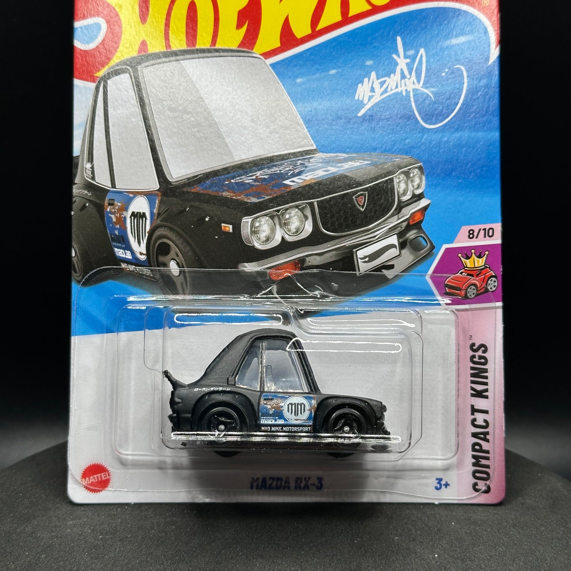 Hot Wheels Mad Mike Tuned Mazda RX3 in black. There are multiple available and you might not get the exact one in the picture. They are all in good condition but may have slightly soft corners or lightly dented edges. All Hot Wheels will be individually wrapped in bubble wrap and shipped in a box for added protection.