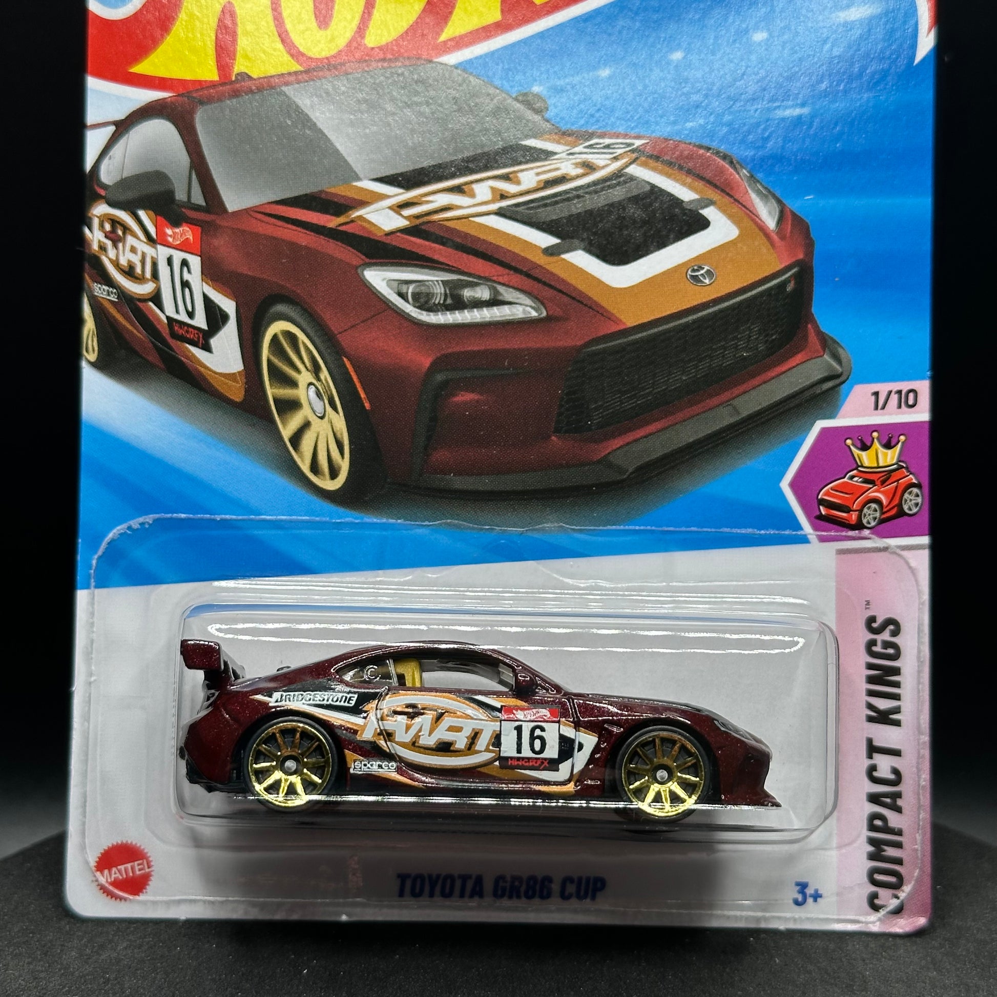 Hot Wheels Toyota GR86 Cup in maroon. There are multiple available and you might not get the exact one in the picture. They are all in good condition but may have slightly soft corners or lightly dented edges. All Hot Wheels will be individually wrapped in bubble wrap and shipped in a box for added protection.