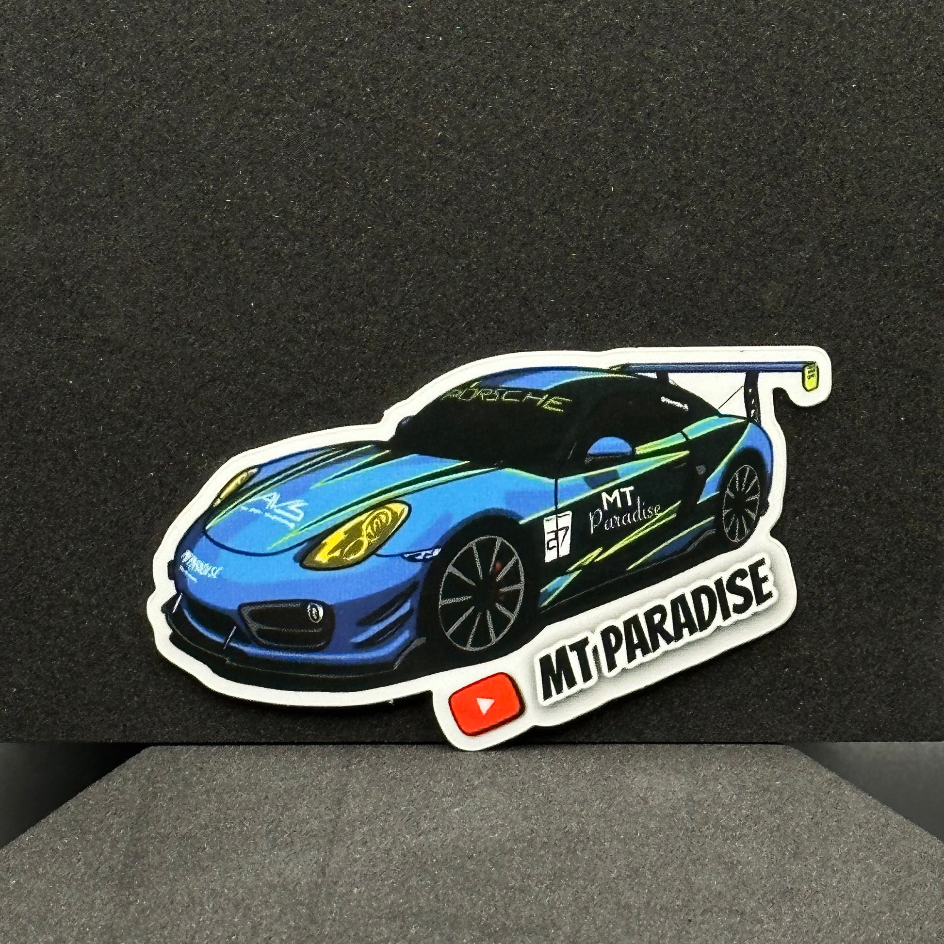 This was the first project car on my YouTube channel with some crazy 1 of 1 parts. It was a 2014 Porsche 981 S Sport Chrono. Custom wrap by Apex Vinyl Solutions LLC, exhaust that shot blue flames, chassis mounted race wing, full aero and so much more. The MT Paradise Porsche Sticker is a great way to keep the great memories alive.