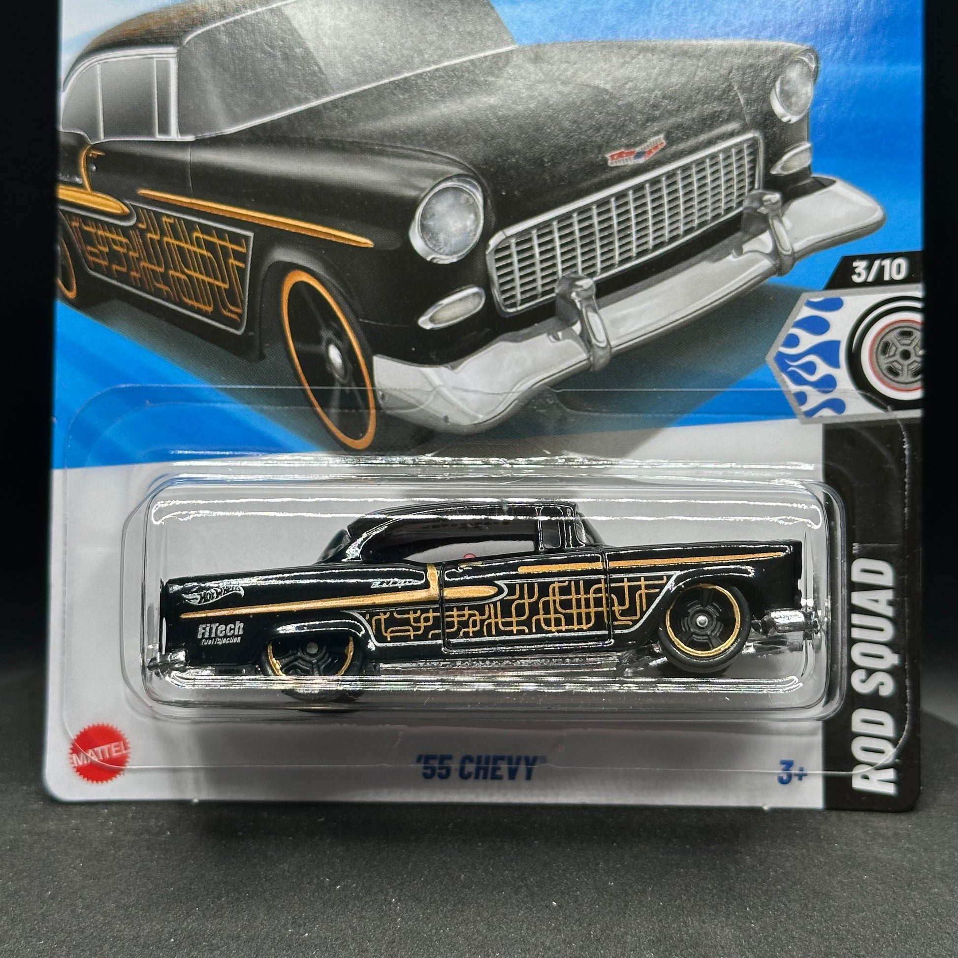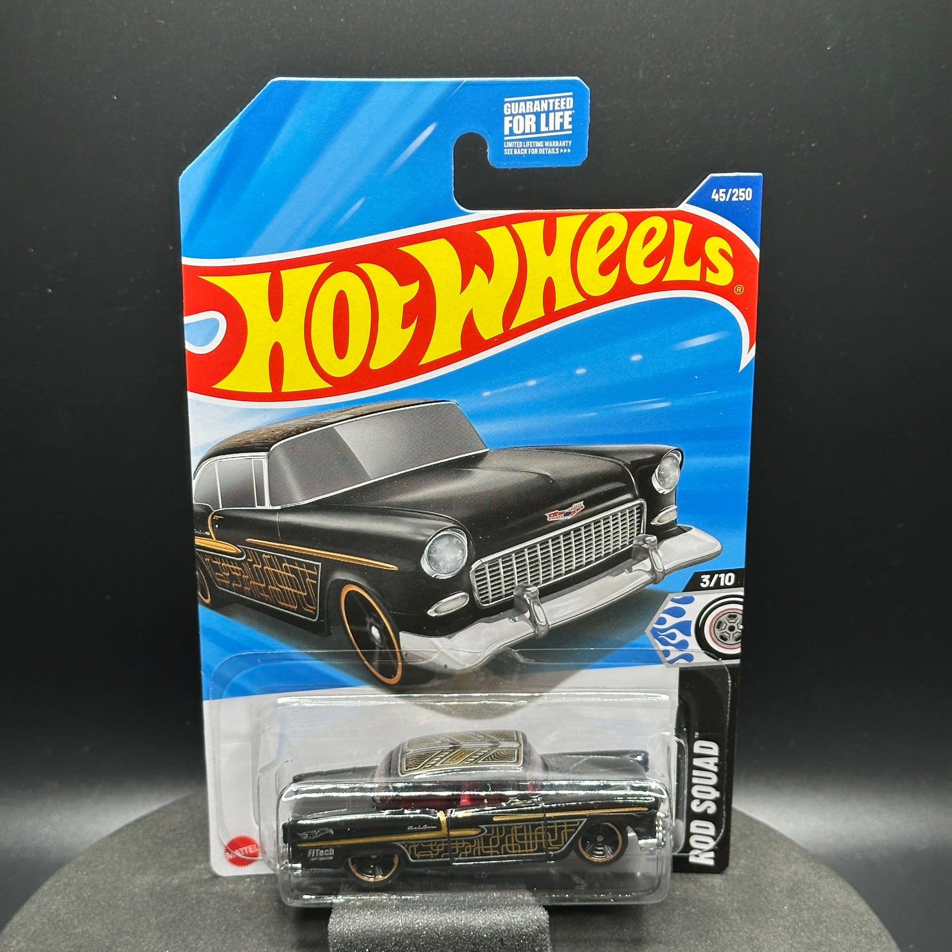 Hot Wheels ‘55 Chevy in black with gold designs. There are multiple available and you might not get the exact one in the picture. They are all in good condition but may have slightly soft corners or lightly dented edges. All Hot Wheels will be individually wrapped in bubble wrap and shipped in a box for added protection.